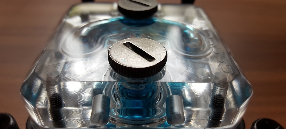 Der Alphacool Eisblock XPX Pro Aurora Light aus Kupfer und Acryl ist mit seinen Abmessungen schon auf dem Schreibtisch ein…