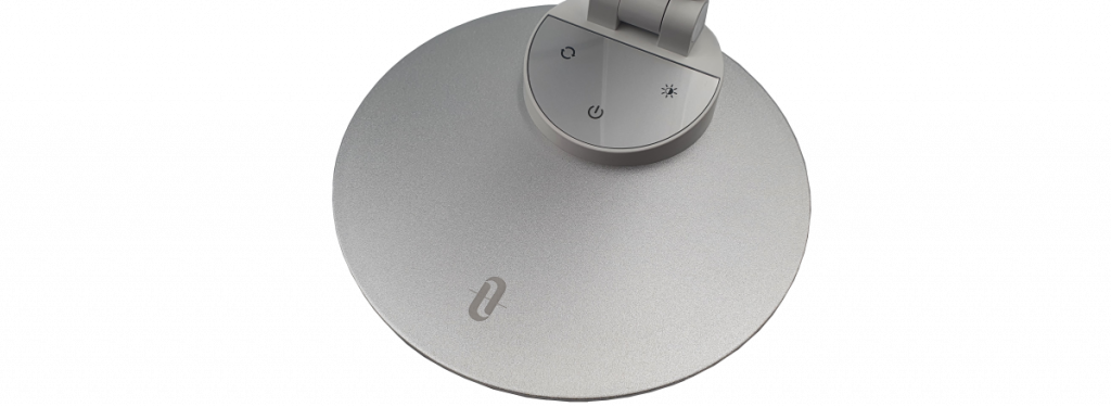 Die Bedienelemente befinden sich im Fuß der Lampe. Hier handelt es sich um drei Bedienelemente, die auf Berührung reagieren. Über die linke Fläche kann durch die fünf Farbtemperaturen geschaltet werden, über die Mittlere lässt sich die Lampe ein- beziehungsweise ausschalten und über die rechte Fläche kann die Lampe in fünf Stufen gedimmt werden. Auf der Unterseite befindet sich auf ganzer Fläche eine schwarze Gummiauflage, die für einen sicheren Stand sorgen soll. Am Sockel der Lampe ist ein USB Anschluss eingebaut, über diesen lassen sich diverse Geräte laden – unabhängig davon, ob die Lampe ein- oder ausgeschaltet ist.![]()