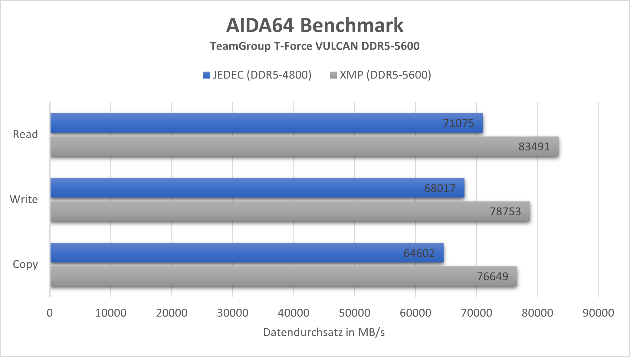 Ohne aktiviertes XMP nutzt der Arbeitsspeicher in unserem System ein DDR5-4800-Profil, wobei wir eine Schreibgeschwindigkeit von 71075 MB/s, eine Lesegeschwindigkeit von 68017 MB/s und eine Kopiergeschwindigkeit von 64602 MB/s erreichen. Erst durch die Aktivierung von XMP erreichen wir die beworbene Transferleistung von DDR5-5600, wo wir dann eine Schreibgeschwindigkeit von 83491 MB/s, eine Lesegeschwindigkeit von 78753 MB/s sowie eine Kopiergeschwindigkeit von 76649 MB/s erreichen. Dies entspricht einer durchschnittlichen Steigerung von 17,3 %.