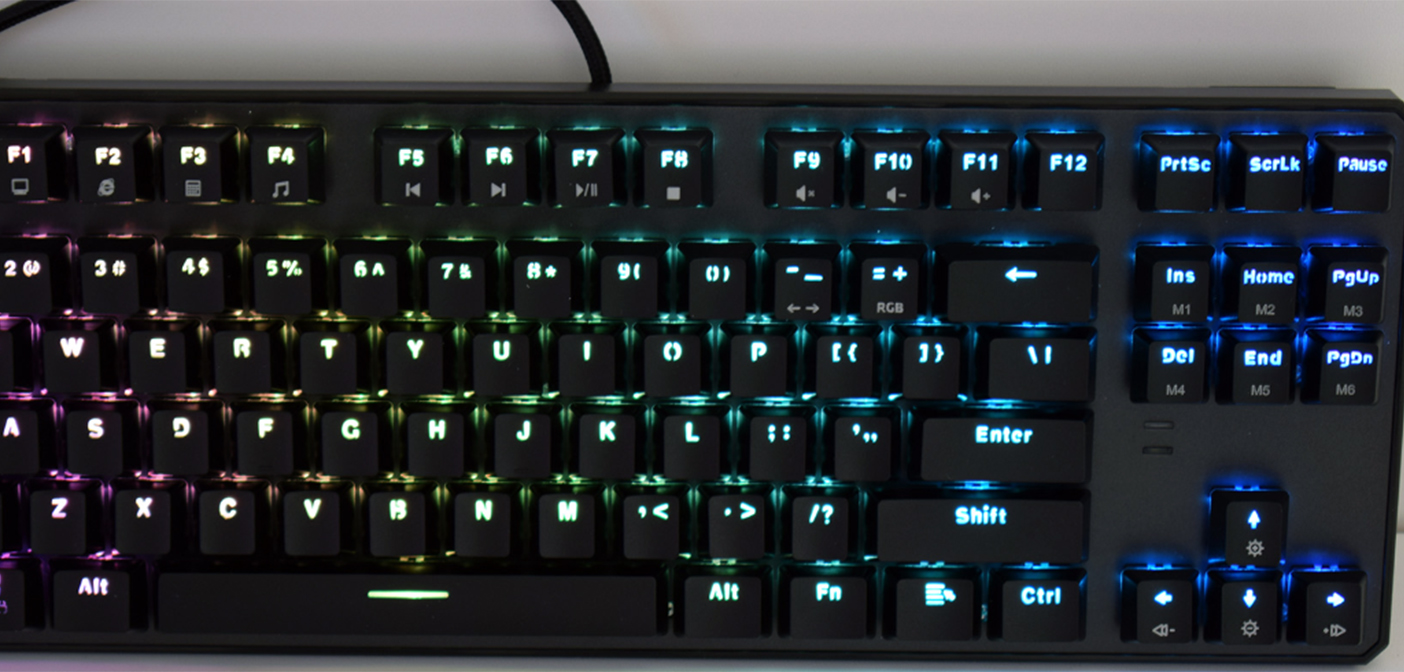 18 verschiedene RGB-Setups sind vorgegeben und ermöglichen uns eine riesen Auswahl an Beleuchtungen. Auch die Makro-Aufzeichnung können wir über die Software gut bedienen. Die Software und die TECWARE Phantom RGB 87-Key sind in der Zeit ohne Probleme gelaufen. Auch in Overwatch ließen uns die Tasten und die Software nicht im Stich. Die Multimediatasten sind einfach zu bedienen und auch der Wechsel der drei Profile läuft einwandfrei. Im rechten Feld finden wir auch sechs M-Tasten, welche per FN den Zugriff zu Makros liefern können. Vorspulen, Lautstärke regeln, Helligkeit, Browser oder RGB-Profil wechseln funktionieren wunderbar.