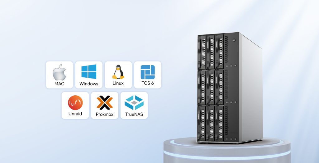 Das D9-320 wurde auf Vielseitigkeit ausgelegt und lässt sich nahtlos in mehrere Betriebssysteme integrieren, darunter Windows, Mac OS, Linux, TerraMaster OS, Unraid, TrueNAS und Proxmox. Seine USB-Typ-C-Schnittstelle ist mit USB 3.0/3.1/3.2-, USB 4-, Thunderbolt 3- und Thunderbolt-4-Anschlüssen kompatibel. Es unterstützt die gemischte Installation von 3,5-Zoll- und 2,5-Zoll-HDDs/SSDs.