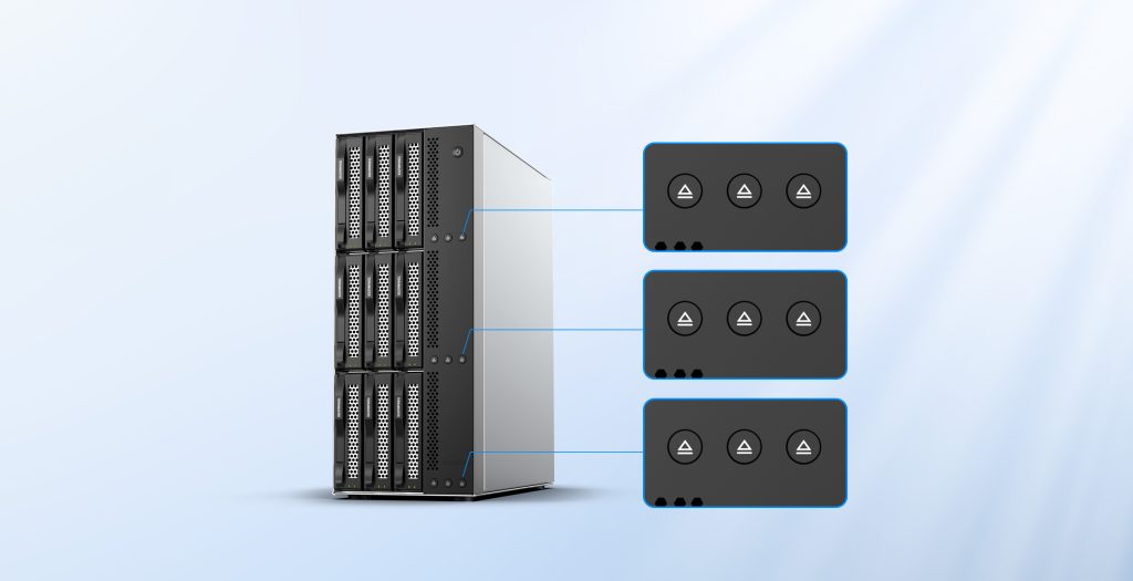 Das D9-320 führt ein Energiemanagementsystem mit neun unabhängigen Laufwerksnetzschaltern und einem Hauptnetzschalter ein. Benutzer können nicht genutzte Laufwerke abschalten, um Energie zu sparen und die Lebensdauer der Laufwerke zu verlängern. Sein intelligenter Abschaltschutz gewährleistet ein sicheres Auswerfen der Laufwerke und ein Parken der Köpfe vor dem Herunterfahren und verhindert so Schäden durch plötzlichen Stromausfall – ein häufiges Problem, das die SMART-Metriken in herkömmlichen Gehäusen beeinträchtigt. Darüber hinaus fährt die Stromwiederherstellungsfunktion das Gerät entweder nach einem normalen Ausschalten herunter oder startet es nach einem unerwarteten Ausfall automatisch neu, wodurch es ideal für unbeaufsichtigte Server- und NAS-Set-ups ist.