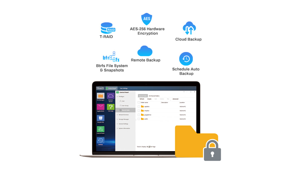 Das F4-421 verfügt über eine überlegene Speichertechnologie und eine optimierte Snapshot-Technologie des Btrfs-Dateisystems. Dies bietet fortschrittlichen Datenschutz, Vermeidung von Datenkorruption und minimale Wartungskosten. Anwender profitieren von einer flexiblen, speicherplatzsparenden erweiterten Datensicherung auf Datei- oder Ordnerebene mit effizienter Datenwiederherstellung.