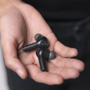 Im Lieferumfang befinden sich die Teufel AIRY SPORTS und eine kleine Aufbewahrungsbox, deren Verarbeitung sehr edel wirkt. Der Inhalt besteht aus einem USB-Ladekabel und vier Ersatzmuscheln.![]()