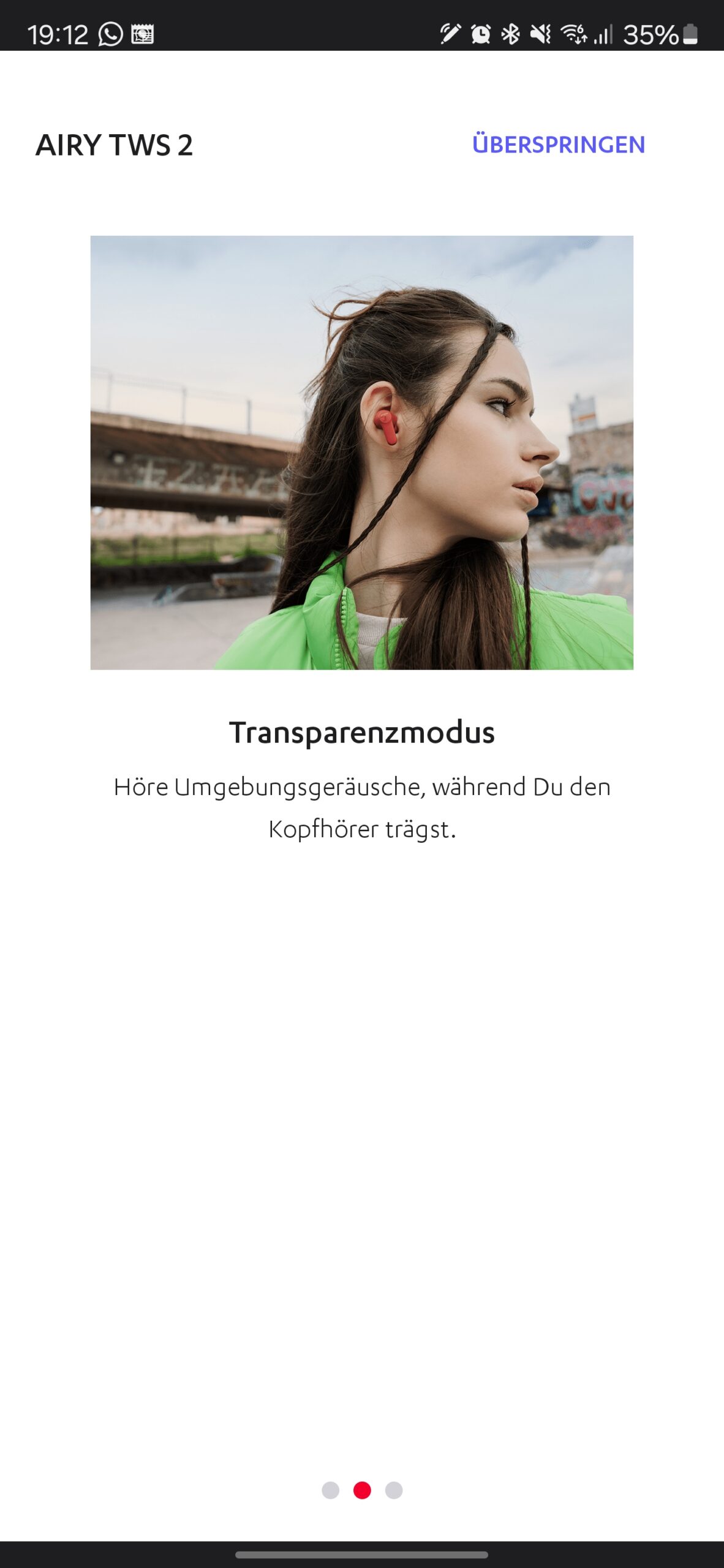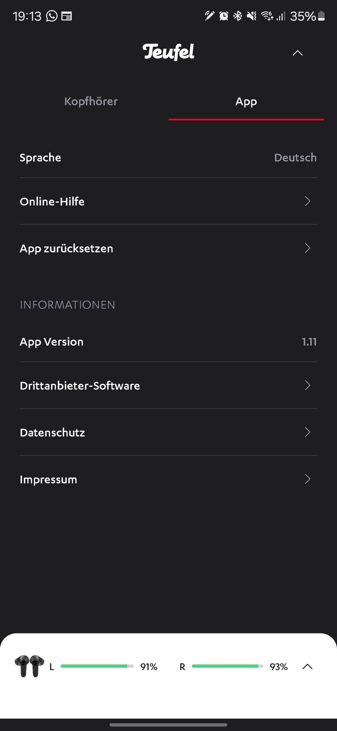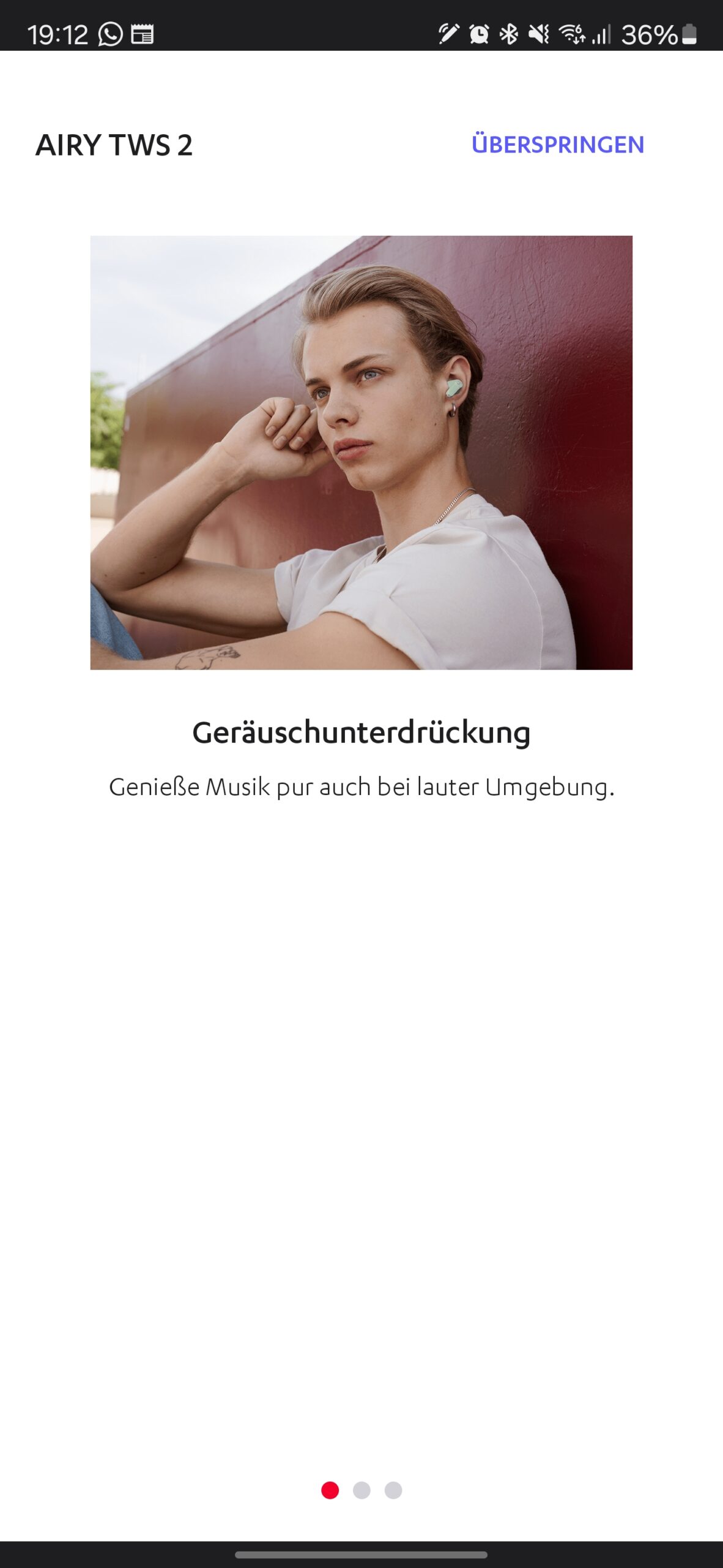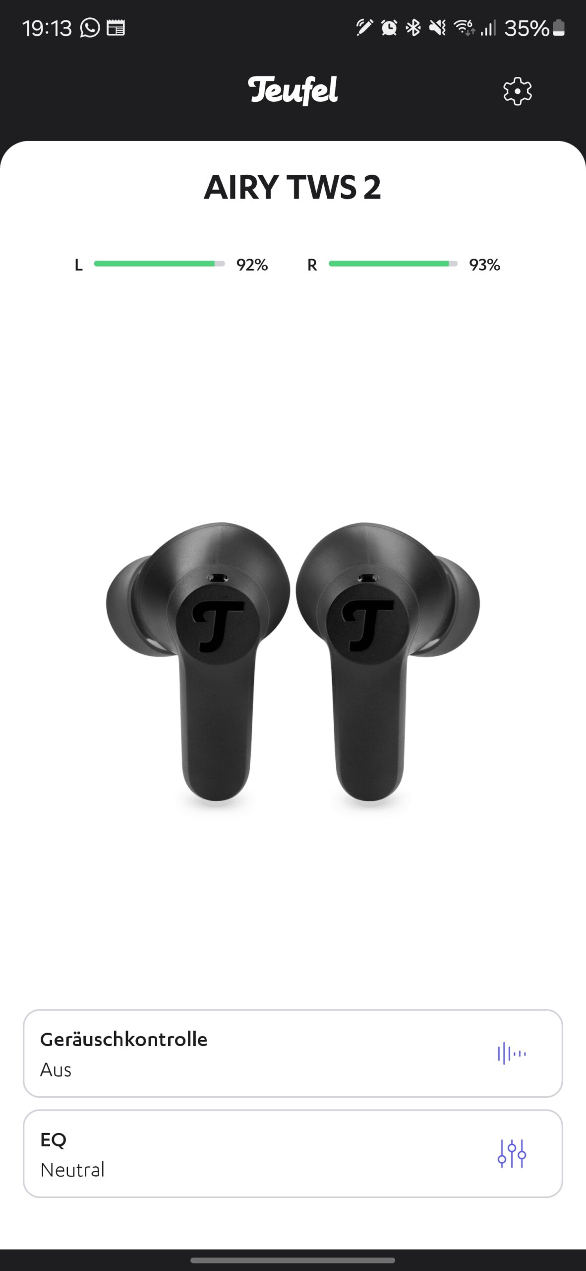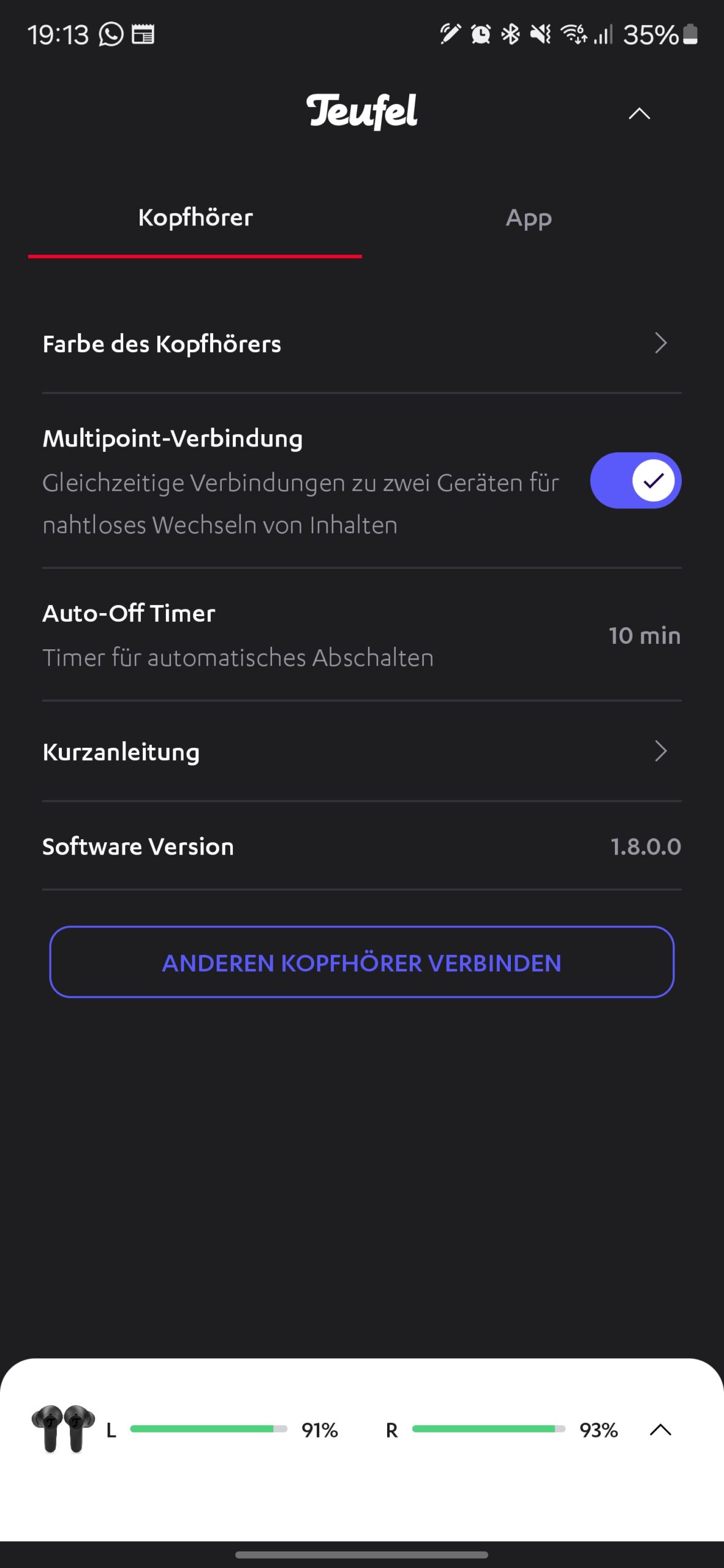 Sobald die App eingerichtet ist, zeigt sie die AIRY TWS 2 mittig im Bildschirm auf einer weißen Oberfläche an. Im oberen Bereich sehen wir die Modellbezeichnung und den Ladestatus der einzelnen Earbuds. Im unteren Bereich gelangen wir zur Geräuschkontrolle über die wir „Aus“, „ANC“ und „Transparenz“ auswählen können. Im gleichen Menü wird in kurzen Worten beschrieben, welche Funktion gerade aktiv ist. Weiterhin befindet sich am oberen rechten Rand ein Zahnrad für die Einstellungen der Kopfhörer und der App selbst. Bei den Kopfhörern können wir die Farbe festlegen, die Multipoint-Verbindung aktivieren, einen Auto-Off-Timer festsetzen, die Kurzanleitung abrufen und die Softwareversion einsehen.