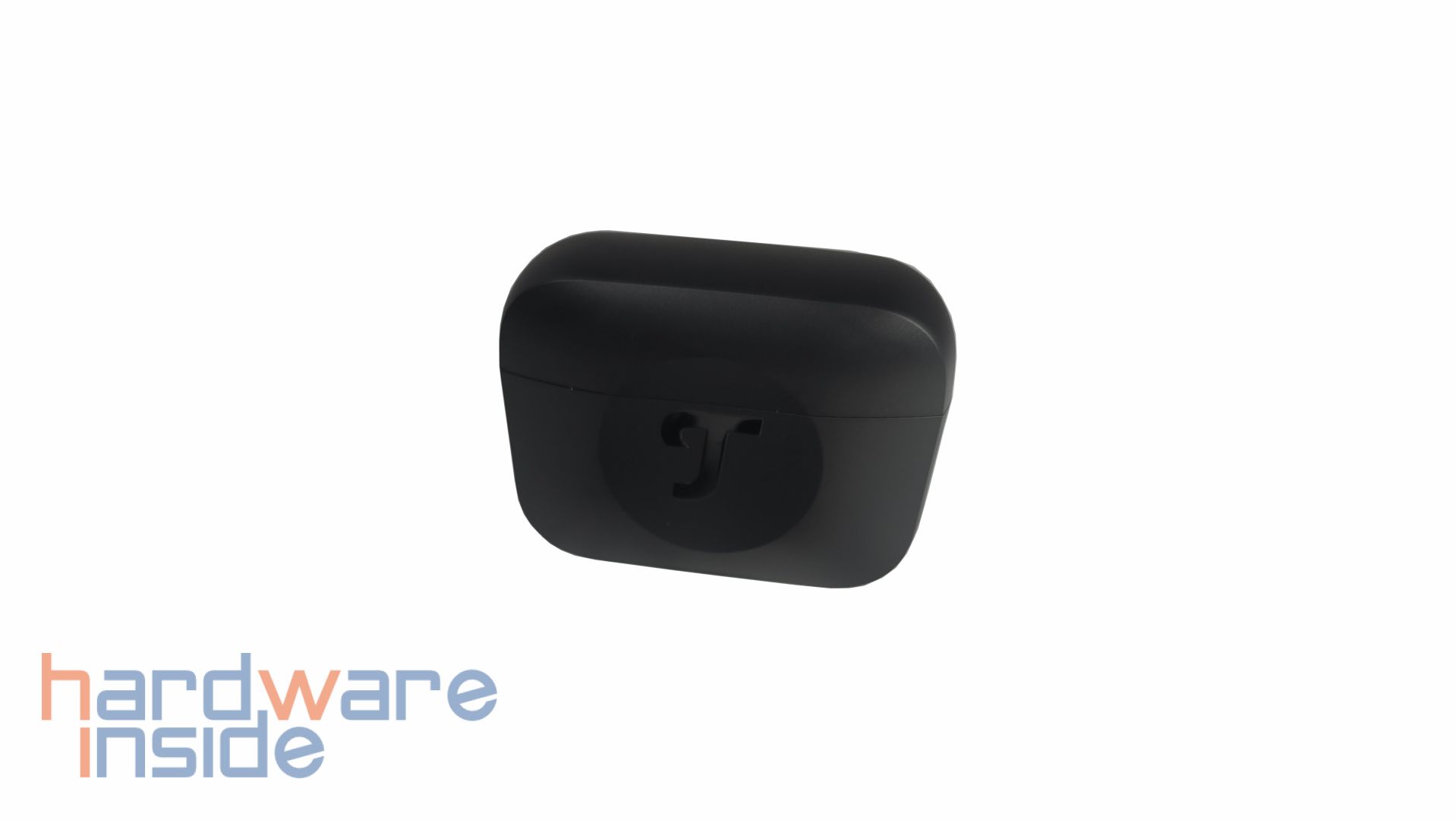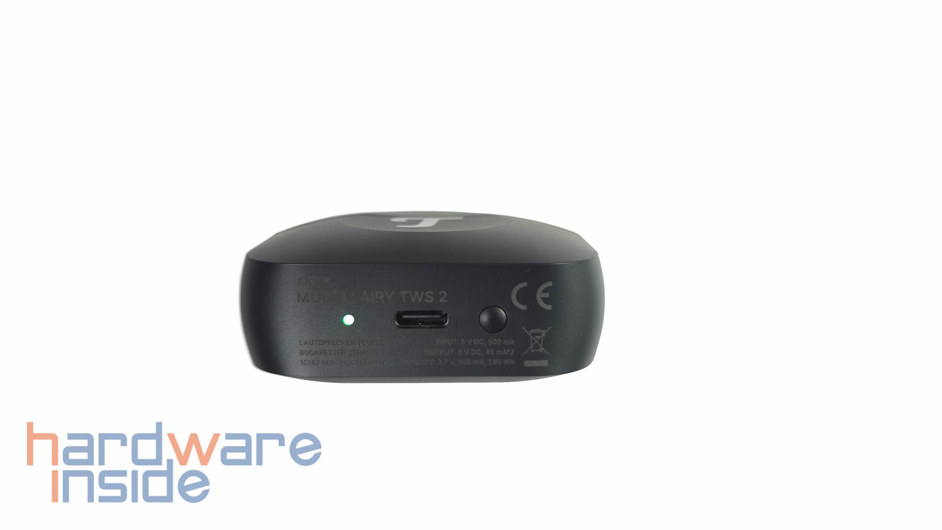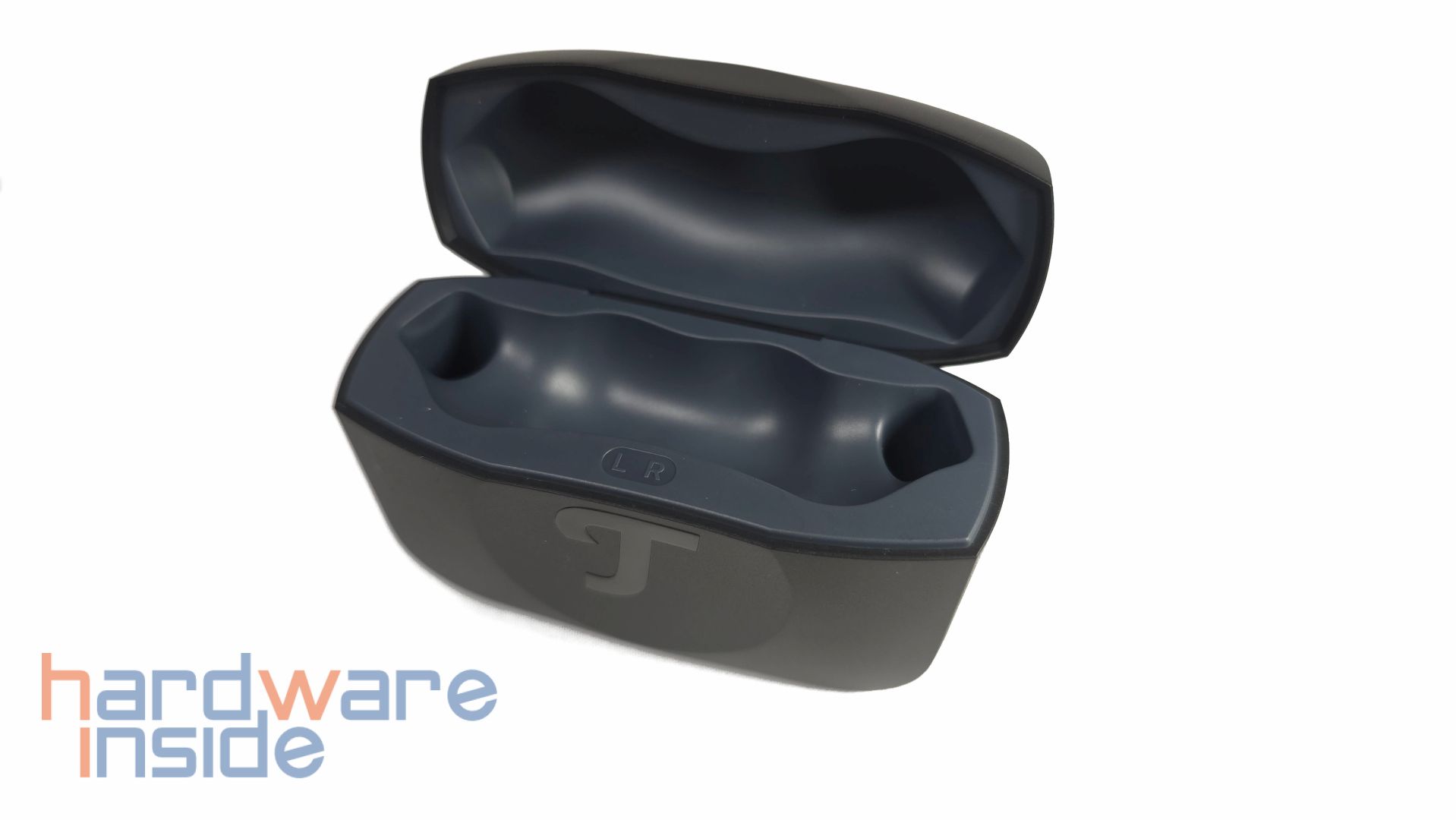 Im Inneren befinden sich die zwei Ohrhörer kompakt eingelegt mit einer „L“ und „R“ Markierung. Die Ladeschale wird beim Schließen magnetisch gehalten. Das offene Ladeetui kann mit leichtem Kraftaufwand geschlossen werden, sodass es nicht ungewollt zufällt. Beim Öffnen der Schale gibt die LED an der Unterseite ein Feedback zum Ladezustand. Die Ohrhörer werden im Case ebenfalls magnetisch gehalten und fallen auch bei stärkerem Schütteln kopfüber nicht heraus.
