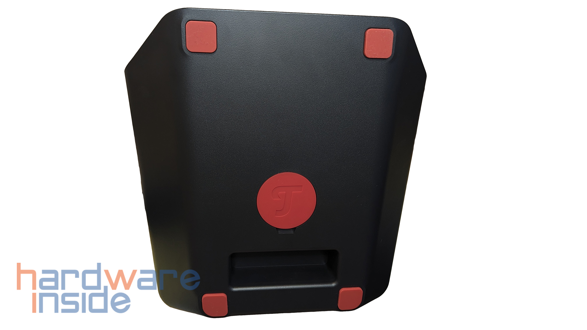 Die Standfestigkeit des Teufel ROCKSTER AIR 2 wird nicht nur durch sein Eigengewicht gewährleistet, sondern auch durch die vier gummierten Standfüße, die für einen sicheren Halt sorgen. Neben dem Tragegriff befindet sich eine kleine rote Gummiabdeckung mit dem Teufel-Logo in der Mitte der Unterseite. Dahinter verbirgt sich eine Vorrichtung zur Befestigung eines Boxenstativs, das den professionellen Einsatz des ROCKSTER AIR 2 ermöglicht. So kann der Lautsprecher z.B. in eine erhöhte Position gebracht werden, was besonders bei Events mit vielen Menschen von Vorteil ist.