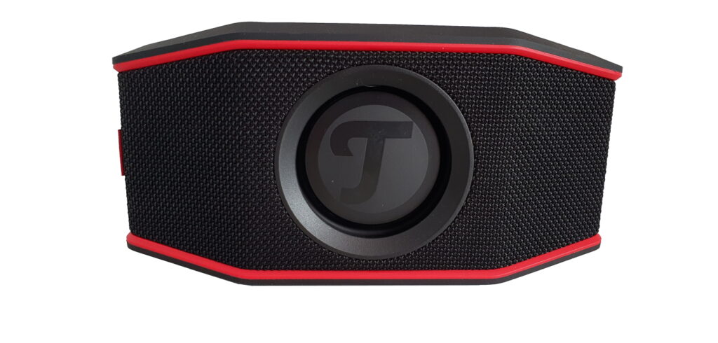 Schon auf den ersten Blick wirkt der Teufel ROCKSTER GO sehr wertig. Dazu trägt insbesondere die Bespannung mit dem schwarzen Gewebe auf der Vorderseite bei. Am Rand hat Teufel auch noch umlaufende rote Elemente untergebracht, das ist nicht nur ein typisches Merkmal des Herstellers sondern unterstreicht auch die Formgebung. Mittig ist die passive Membrane mit einem Durchmesser von 70 mm. Rundum besteht das Gehäuse ansonsten aus einem Kunststoff, der mit einer Gummierung ausgestattet ist. Dementsprechend griffig fühlt sich der Lautsprecher auch in unserer Hand an. Auf der Rückseite sind an den Seiten zwei Befestigungspunkte für die Handschlaufe untergebracht, während im oberen Bereich die ersten Bedienelemente in diesem Test zu sehen sind. Links befindet sich die Taste zum Ein- bzw. Ausschalten, gefolgt von vier LEDs. Diese zeigen den Status und den Ladezustand des Akkus an. Rechts vom Teufel Logo ist die zweite Taste zu finden, welche für das Herstellen der Bluetooth Verbindung zuständig ist.