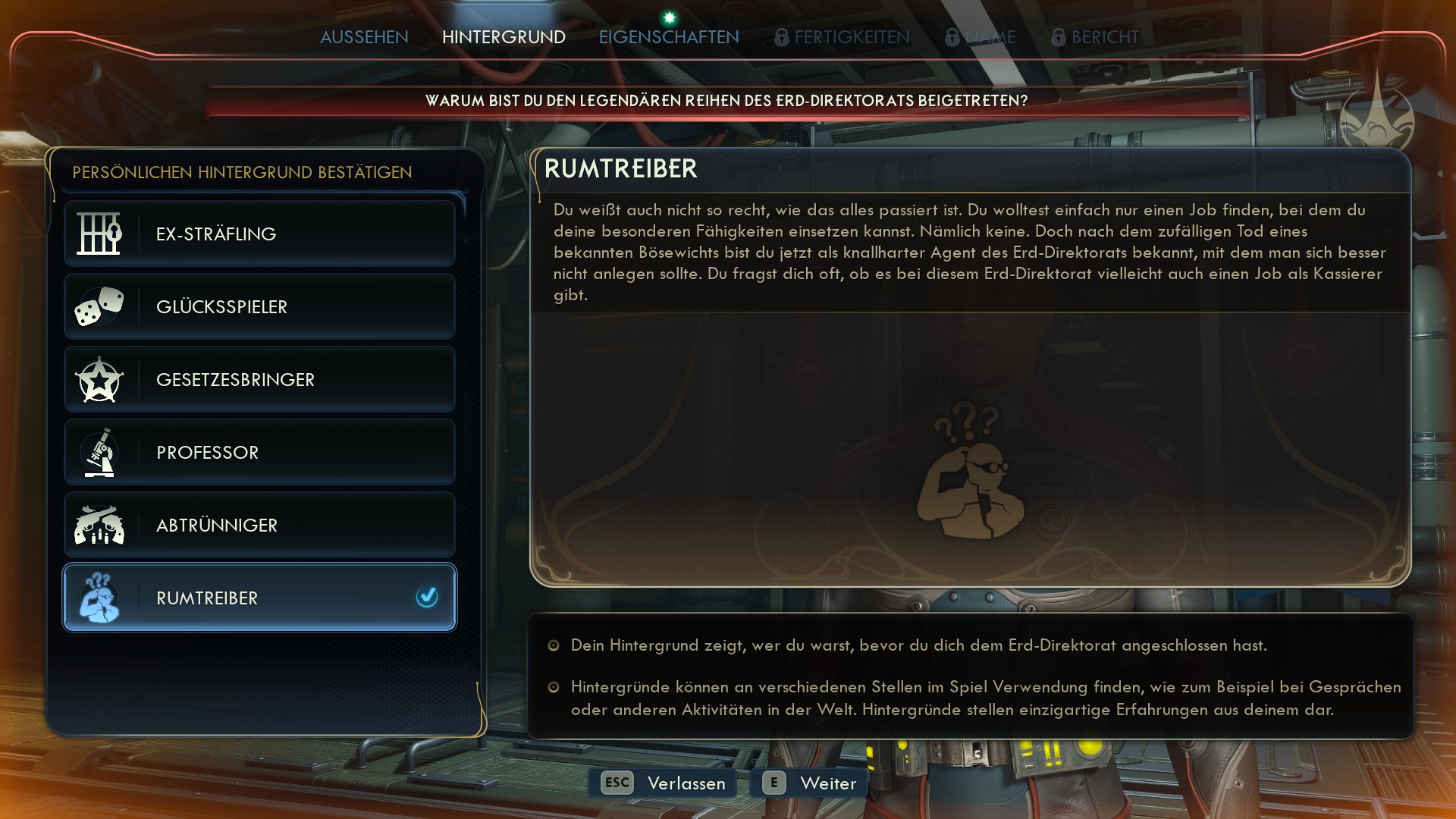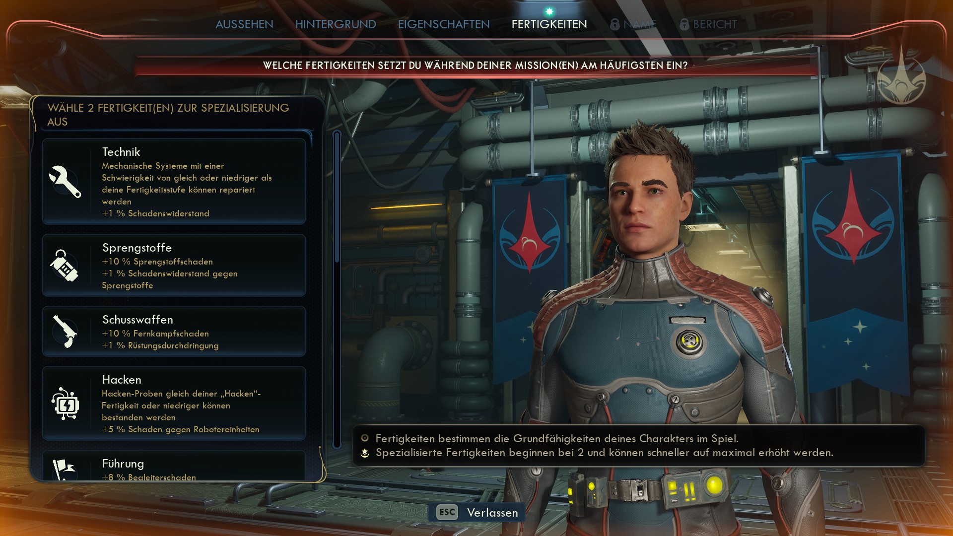 Während der Charaktererstellung gibt uns The Outer World 2 die Wahl zwischen vielen verschiedenen Optionen. Wer hier eine Tiefe vergleichbar mit Baldur“s Gate 3 erwartet, wird allerdings bitter enttäuscht. Jedoch sind die kosmetischen Optionen, für ein First-Person RPG in dem man den eigenen Körper lediglich in Menüs sieht, mehr als nur ausreichend. Die Erstellung unseres Commanders führt uns nach den kosmetischen Optionen dann weiter in die Optionen, die das Gameplay drastisch ändern können. Im Hintergrund-Menü haben wir die Auswahl zwischen sechs verschiedenen Hintergrundgeschichten. Diese eröffnen während des Spielens verschiedene Dialogoptionen und möchten gut gewählt sein. Es folgt das Eigenschafts-Menü. Hier wählen wir eine besondere Fähigkeit unseres Hauptcharakters, von purer Muskelkraft über erhöhte Intelligenz bis hin zu stupidem Glück ist hier alles zu finden, was das Herz begehrt. Wer eine zweite Stärke möchte, ist hier ebenfalls gezwungen eine Schwäche zu wählen, dessen Schwere von kleinerer Unannehmlichkeit zu spielverändernder Herausforderung variiert. Das letzte wichtige Menü in der Charaktererstellung ist das Fertigkeiten-Menü. Dieses erlaubt uns zwei Fertigkeiten zu wählen, die während des Spielens einfacher aufzuleveln sind und mit einem kleinen Startbonus auf unsere Stats verbunden sind. Zuletzt geben wir unserem Commander einen Namen und sind dann bereit ins Spiel zu starten.
