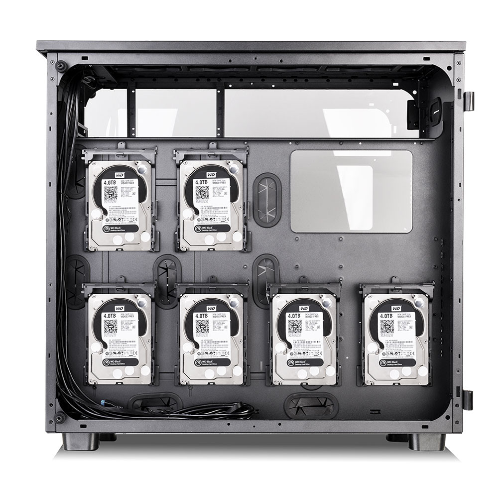 Neben den vier eingebauten 140mm Riing Plus LED RGB Lüftern mit dem patentierten 16,8 Millionen Farben LED-Ring, 12 einzeln ansteuerbare LEDs und digitale PWM-Steuerung über die patentierte Riing Plus RGB Software bieten, bietet der View 91 TG RGB Platz für bis zu zwei große 200mm Lüfter oben, drei 140mm Lüfter unten, während im Gehäuse noch Platz für bis zu sechs 200mm Lüfter ist.