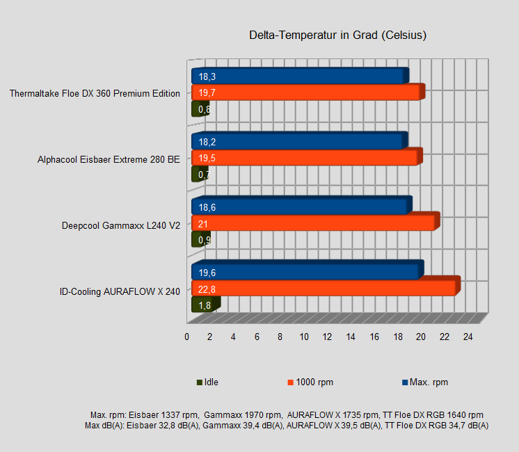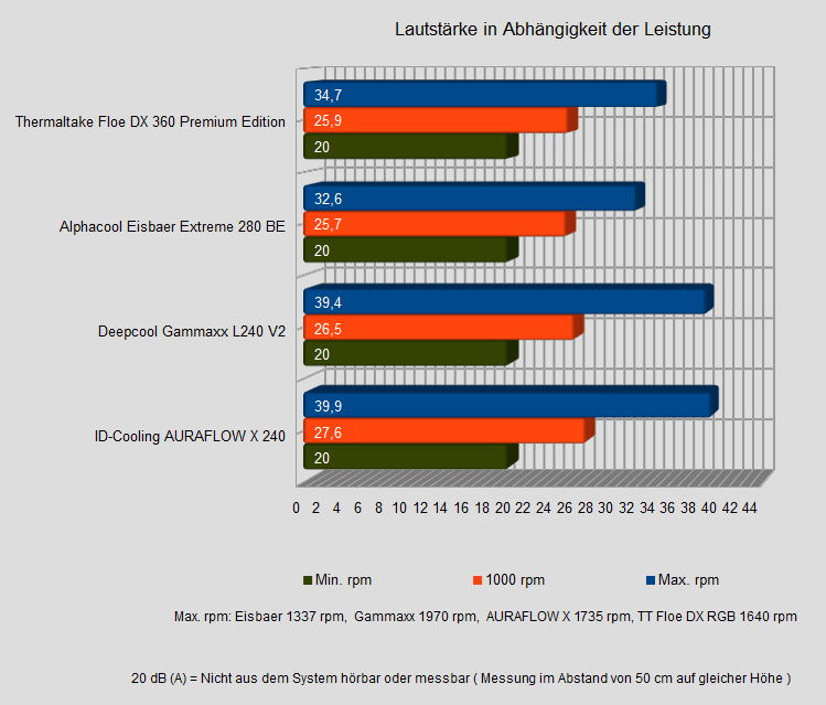 Die Lautstärke der 1000 Umdrehungen pro Minute unterscheiden sich nicht deutlich. Die Lautstärke kann bei unter 1000 rpm nicht mehr aus dem System heraus ermittelt werden und bietet uns, wie viele andere Kühllösungen auch, ein absolut leises System. Durch die maximale Leistung der Lüfter können wir das Temperaturlimit reduzieren, aber selbst dabei bleibt die Lautstärke im Rahmen. Nur die 140 mm Lüfter der Eisbaer Extrem können das Ergebnis heute toppen.