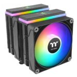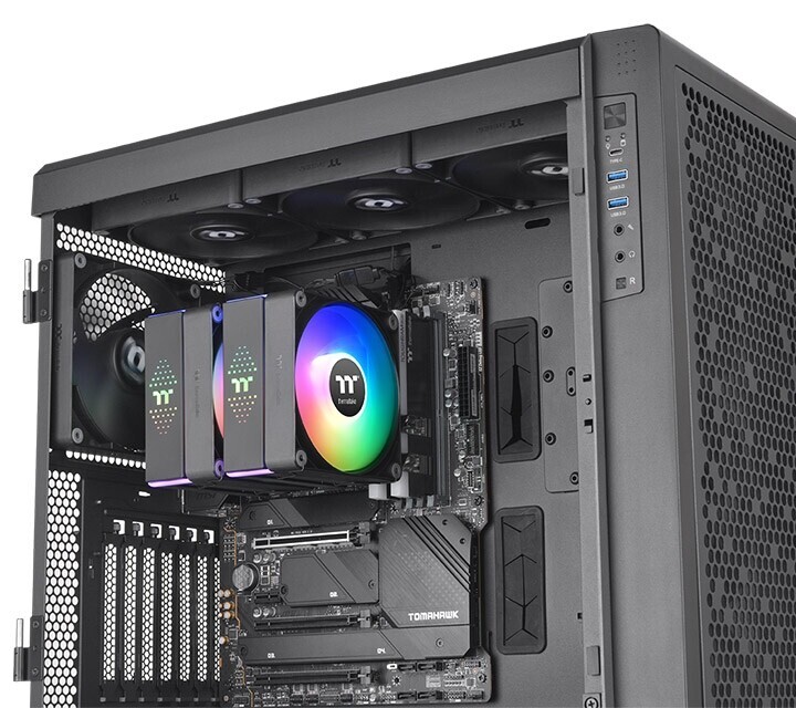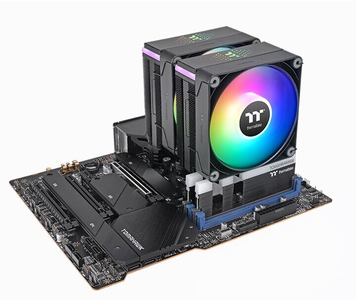 Jeder der beiden mitgelieferten 120-mm-Lüfter verfügt über ein Lager mit einer Lebensdauer von 40.000 Stunden und eine 9-LED-ARGB-Beleuchtung, die aus der Nabe des Laufrads herausragt. Die Lüfter arbeiten mit 4-Pin-PWM, drehen mit 500 bis 1.800 RPM und erzeugen einen Luftstrom von bis zu 65 CFM bei 2,56 mm H₂O statischem Druck und bis zu 26,8 dBA Schalldruck. Selbst mit beiden Lüftern ist laut Thermaltake noch Platz für 1,5x hohe Speichermodule (mit Beleuchtung oder Kühlkörperkronen). Der Kühler hat eine Kühlleistung von 265 W und ist damit für alle führenden Desktop-Prozessoren geeignet. Zu den unterstützten CPU-Sockeltypen gehören LGA1700, LGA1851, LGA1200/LGA115x, AM5 und AM4. Der Kühler misst 124 mm x 137 mm x 160 mm (L x B x H). Das Unternehmen hat keine Preise bekannt gegeben.