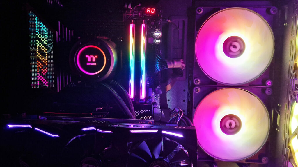 Der Einbau geht gut und unkompliziert von der Hand. Die im Lieferumfang enthaltene Backplate wird mittels der Arretierung für das passende System (Intel oder AMD) verwendet. In unserem Fall ist es der Sockel LGA 1700. Da im Lieferumfang eine Wärmeleitpaste enthalten ist, wird diese nach dem Eindrehen der Abstandshalter auf dem Kühler aufgetragen, direkt montiert und mit den mitgelieferten Rändelschrauben befestigt. Wir entscheiden uns für den Einbau der Thermaltake TH280 V2 ARGB Sync vertikal neben dem Mainboard. Alle benötigten Kabel werden angeschlossen und nochmals kontrolliert. Über die ASUS AURA SYNC Software lassen sich die Beleuchtungseffekte ganz einfach erstellen und detailreiche wie auch vielschichtige Effekte bis zur letzten LED anpassen. Die schwarze Optik des Radiators in Verbindung mit der Farbgebung der zwei CT140 ARGB-Lüfter sieht einfach klasse aus.