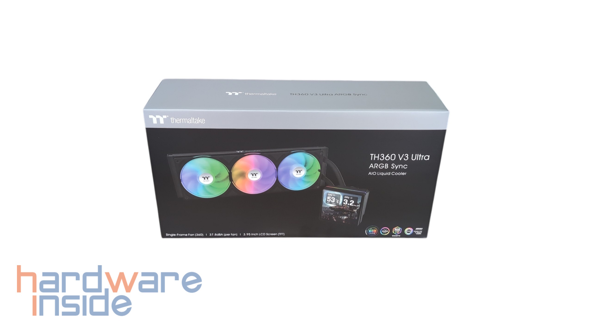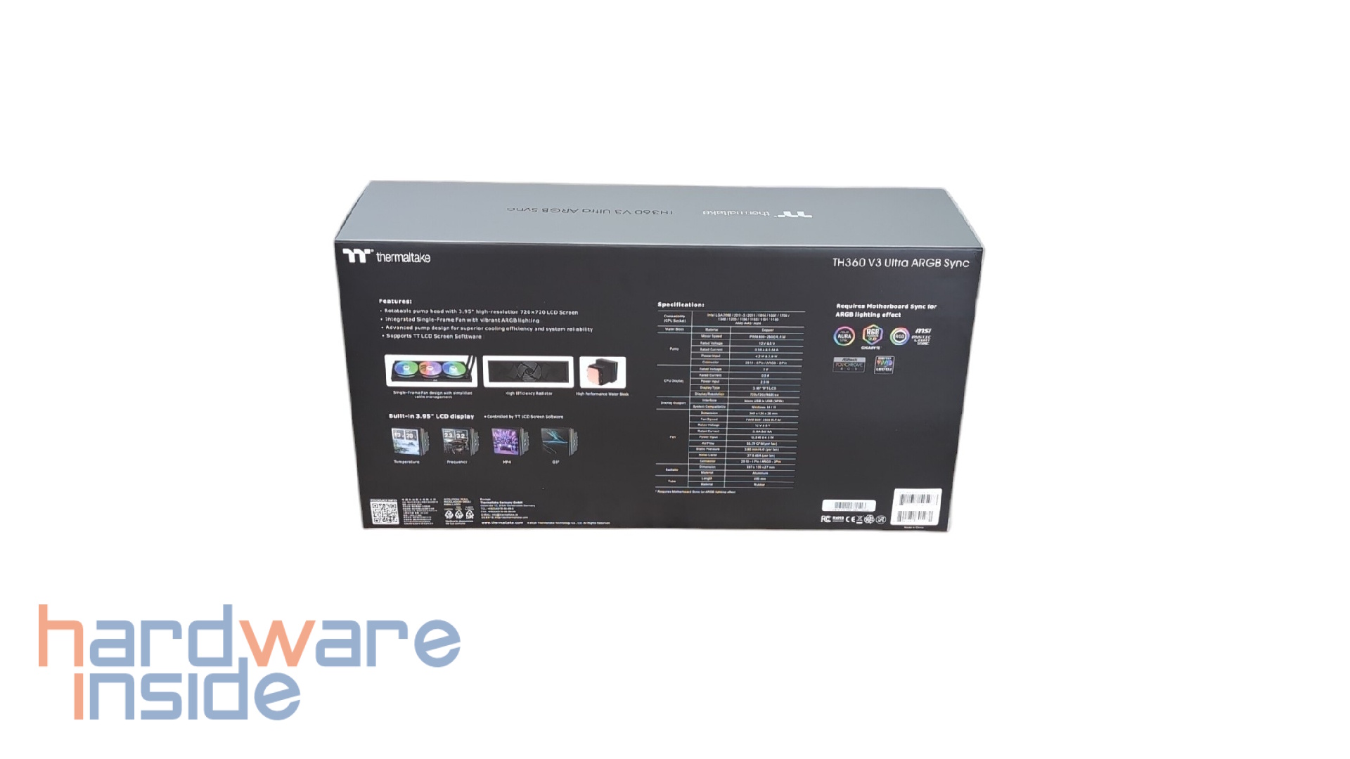 Die Verpackung der Thermaltake TH360 V3 Ultra ARGB Sync ist hochwertig gestaltet und zeigt auf der Vorderseite das Produkt mit den drei ARGB-Lüftern und dem 3,95 Zoll großen LCD-Display der Pumpe. Die Farbgebung in Schwarz und Grau wirkt edel und übersichtlich. Auf der Rückseite finden sich neben einer Auflistung der Features auch technische Daten sowie Hinweise auf die Kompatibilität mit gängigen Mainboard-Herstellern für die ARGB-Synchronisation (ASUS Aura Sync, MSI Mystic Light Sync, Gigabyte RGB Fusion, ASRock Polychrome Sync).
