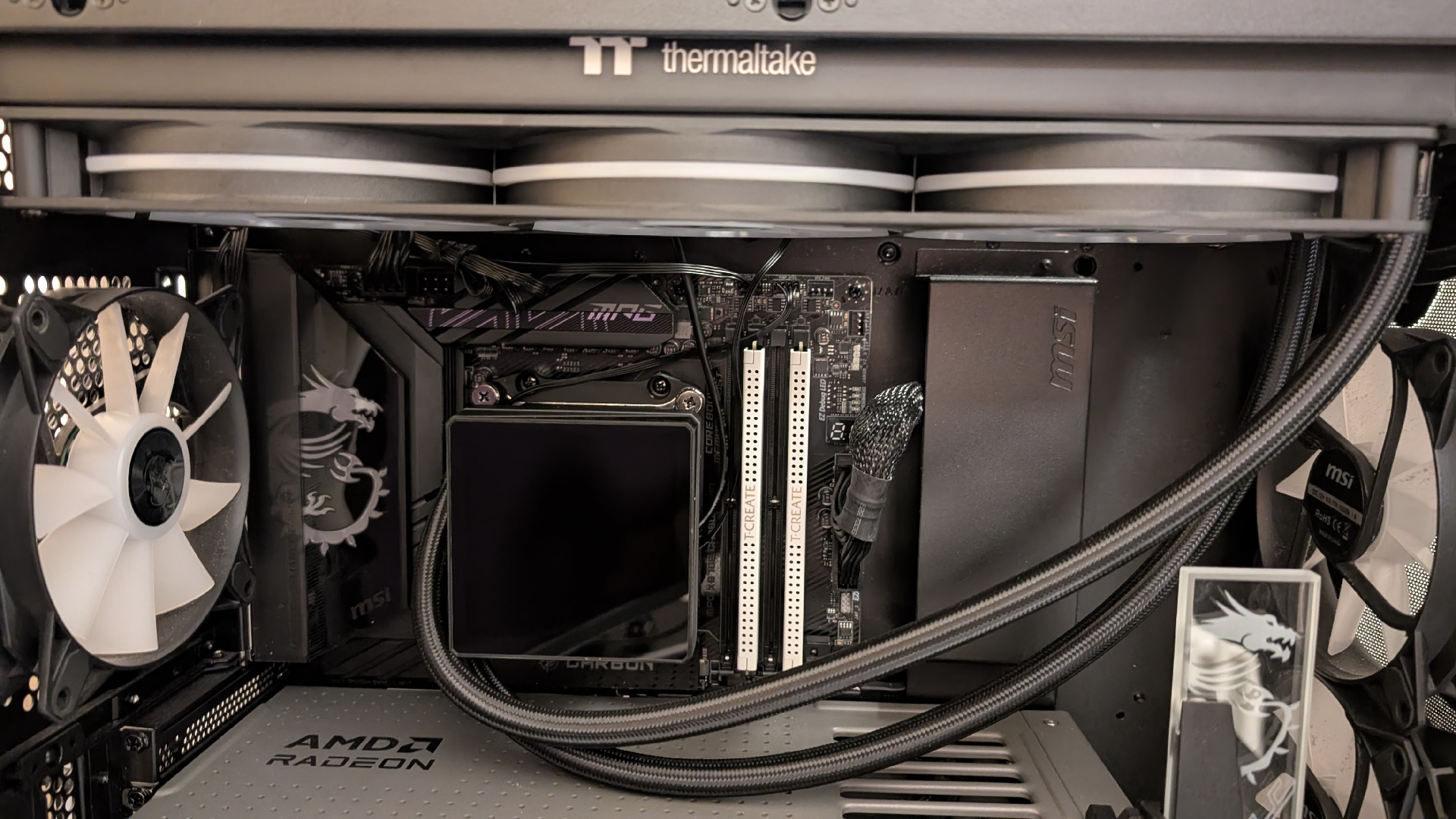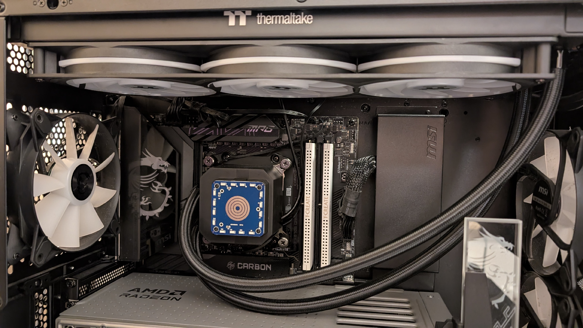 Um die Thermaltake TH360 V3 Ultra ARGB Sync in unserem Testsystem in Betrieb nehmen zu können, sind nur ein paar Schritte notwendig. Zuerst benötigen wir das passende Montageset für unser AM5-System und befestigen die benötigten Schrauben mit den dazugehörigen Haltern. Im nächsten Schritt tragen wir die Wärmeleitpaste auf unsere CPU auf. Der Wasserblock kann nun aufgesetzt werden. Befestigt wird dieser mittels vier Schrauben, danach wird das Display auf den Wasserblock gesteckt. Zum Schluss wird der Radiator samt dem angebrachten Lüfter oben am Deckel verschraubt. Jetzt kann das System gestartet werden.