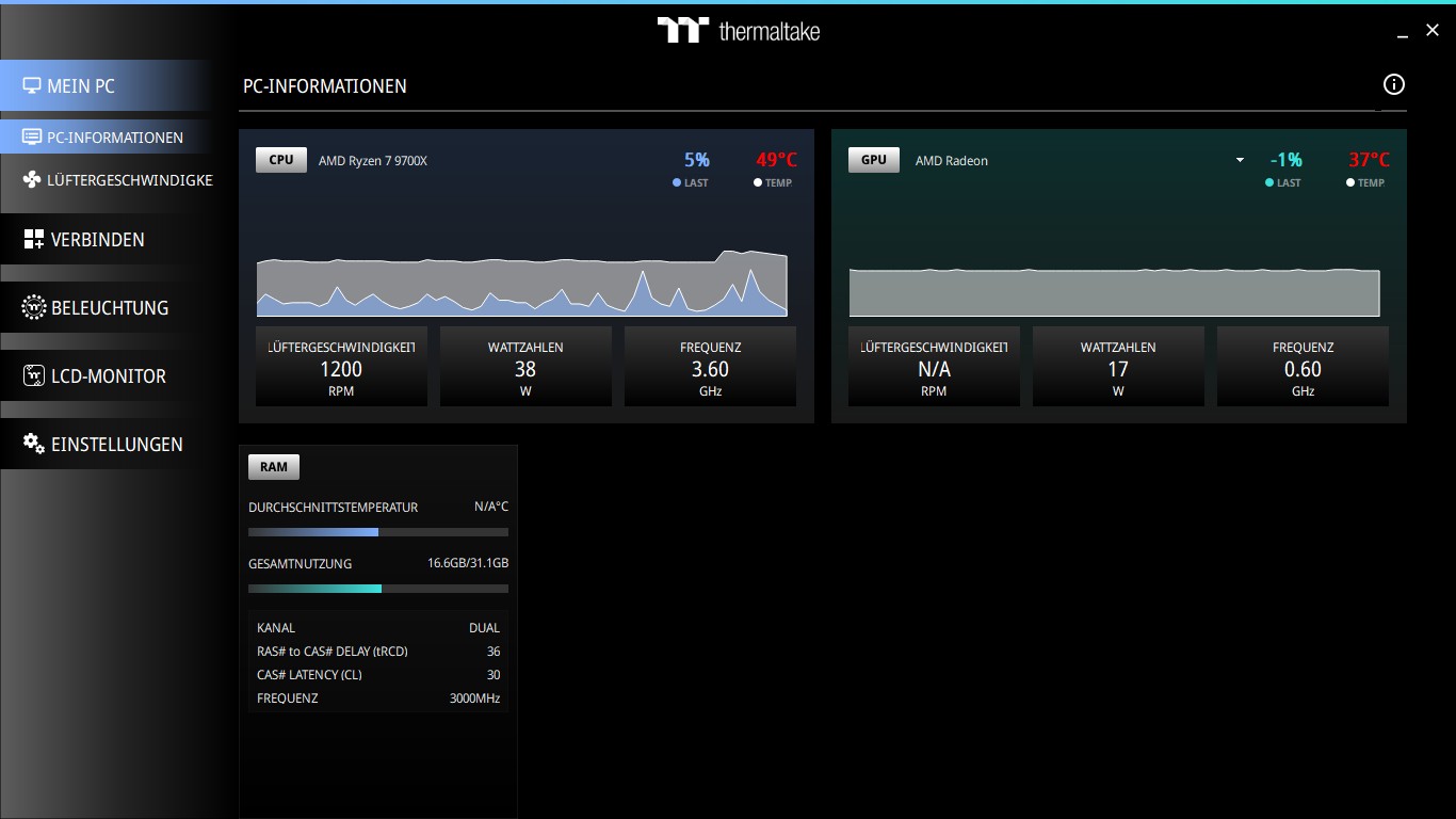 Mit der Software „TT-RGB-PLUS“ können wir die TH360 V3 Ultra ARGB Sync Anzeige des LCD-Displays steuern. Die weiteren Funktionen der Software sind nicht für die AIO gedacht und nur für andere Produkte nutzbar. Auf der Startseite sind die System-Informationen, wie Temperaturen, Lüftergeschwindigkeiten, Stromverbrauch und einiges mehr zu sehen. Für uns ist eigentlich nur der Reiter „LCD-Monitor“ von Interesse, denn hier gelangen wir zu den Einstellungen des Displays.