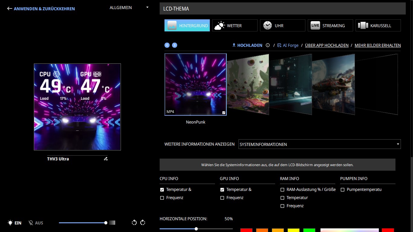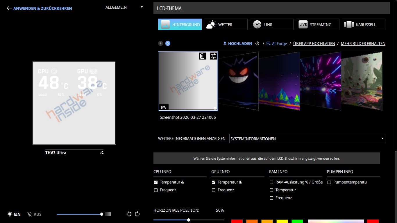 Dort können wir uns Systeminformationen, lokale Wetterdaten, Uhrzeit oder statische und animierte Visuals auf dem Display anzeigen lassen. Dabei stehen uns unter dem Reiter Hintergrund sechs vorgefertigte Kurzvideos zur Verfügung, ebenso ist es möglich weitere Hintergründe hochzuladen. Folgende Dateitypen werden unterstützt: .gif, .jpg, .jpeg, .png, .avi, .mp4 und .mov. Des Weiteren können wir auch über die AI Forge Funktion mittels APIs (DALL-E 3, JINMENG3, Vertax AI und Runway) eigene Hintergründe erstellen. Dafür ist jedoch ein separater Account für die jeweils genutzte API vonnöten. Zudem ist es möglich einen Teil des Bildschirms auf dem Display zu streamen, wie in unserem Beispiel League of Legends.