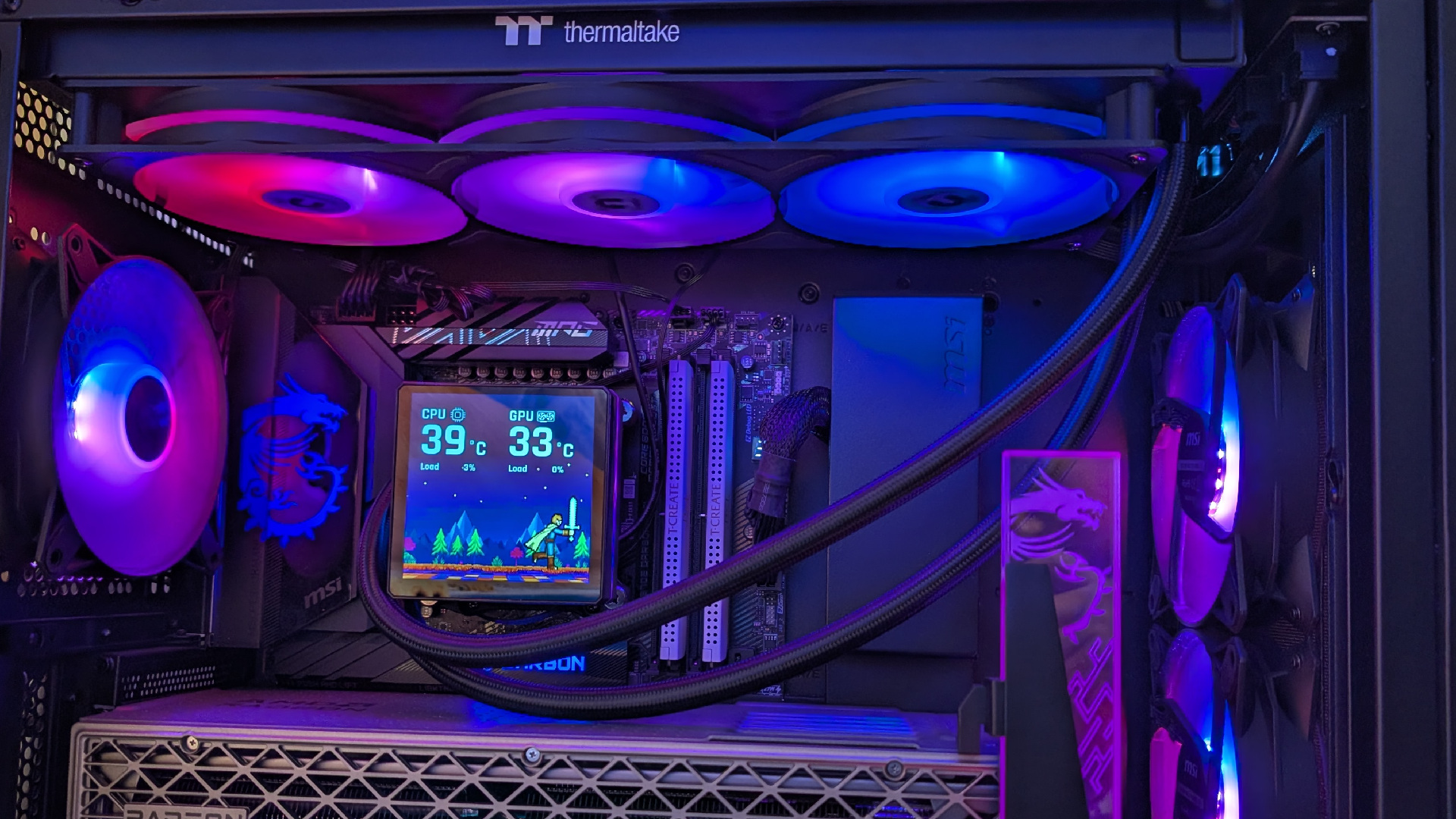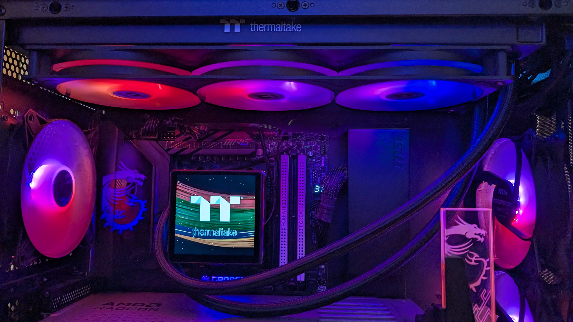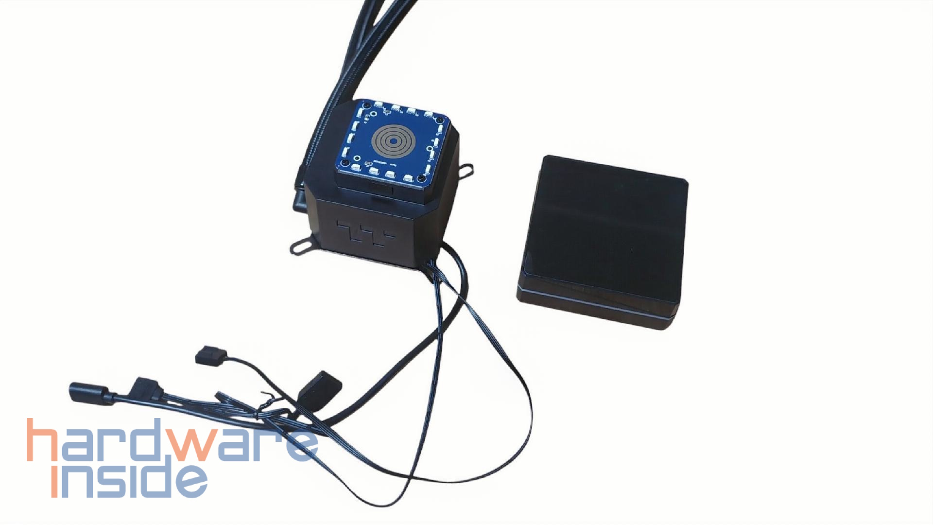 Der quadratische Pumpenkopf beherbergt ein 3,95‑Zoll TFT‑LCD mit 720 × 720 Pixeln, das über die TT‑RGB‑Plus‑Software oder die AI‑Forge‑Funktion mit Systeminformationen, GIFs oder statischen Bildern personalisiert werden kann, die Abdeckung lässt sich dabei drehen, damit die Darstellung unabhängig von der Einbaurichtung korrekt ausgerichtet ist. Eine umlaufende ARGB‑Zone rund um das Display ergänzt die Beleuchtung der Lüfter und lässt sich mit gängigen Mainboard‑RGB‑Systemen synchronisieren, sodass ein einheitliches Beleuchtungsbild im System entsteht.