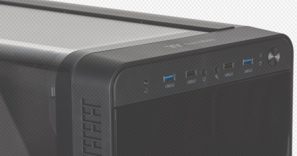Das auffälligste Merkmal des View 37 ist ganz klar das linke Seitenteil aus Acryl, welches sich bis auf die Oberseite des Gehäuses erstreckt. Das Stück kann im Ganzen abgenommen werden und ist über zwei Rändelschrauben und Kunststoffteil mit dem Gehäuse verbunden. Dabei muss erwähnt werden, dass dieses Kunststoffteil durch vier Schrauben mit dem Gehäuse verbunden ist. Sprich es müssen ganze sechs Schrauben gelöst werden, um das Seitenteil abzunehmen. Die Front dagegen besteht aus einem Kunststoffrahmen mit einer stark getönten Acrylscheibe. Seitlich befinden sich Lüftungsöffnungen im Rahmen, welche durch ein eingebrachtes Gitter das Eindringen von Staub verhindern sollen. Im oberen Teil der Front sind die beiden 3,5 mm Audio-Anschlüsse, zwei USB 2.0, zwei USB 3.0 sowie Ein/Aus- und Reset-Taster.