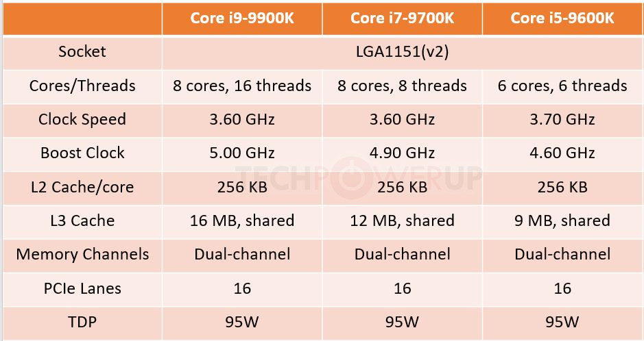 Dieser Chip ist mit 8 Kernen ausgestattet und HyperThreading ermöglicht 16 Threads. Er verfügt über die vollen freigegebenen 16 MB L3-Cache. Er hat auch ordentlich imponierende Taktraten – 3,60 GHz nominal, mit maximal 5,00 GHz im Turbo Boost. Sie erhalten die 5,00 GHz über 1 bis 2 Kerne, 4,80 GHz über 4 Kerne, 4,70 GHz über 6 bis 8 Kerne. Interessanterweise bleibt die TDP dieses Chips unverändert zu seinem Vorgänger bei 95 W. Als nächstes kommt der Core i7-9700K. Dieser Chip folgt anscheinend dem i7-8700K. Er hat 8 Kerne, aber das HyperThreading fehlt.