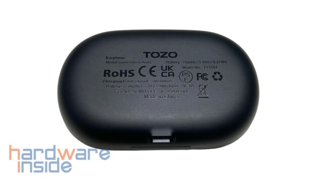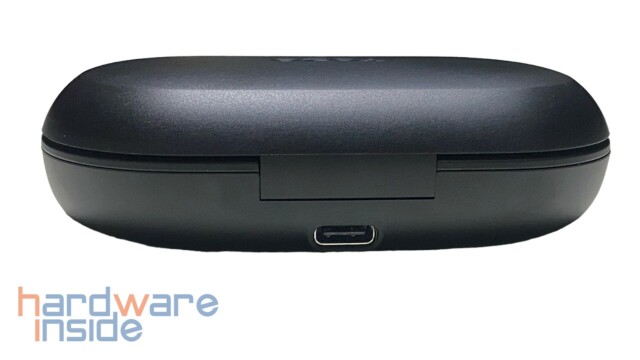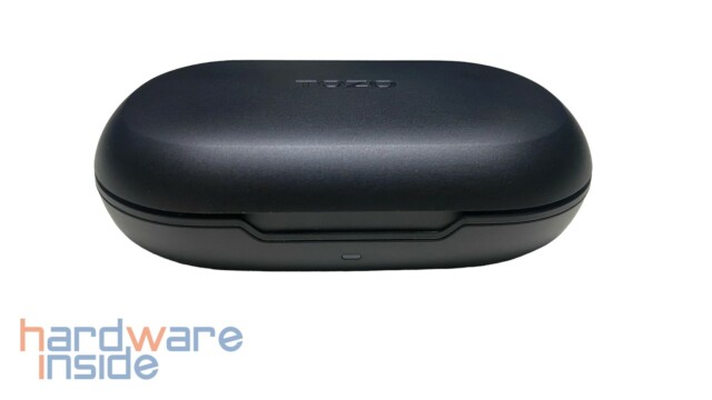 Das ovale Ladecase ist ebenfalls komplett aus Kunststoff gefertigt und kann über eine Fingeraussparung an der Vorderseite geöffnet werden. Darunter ist eine LED als Ladeanzeige untergebracht. Der TYP-C-Anschluss zum Aufladen des internen 650 mAh Akkus ist auf der Rückseite verbaut. Die Unterseite fungiert auch gleichzeitig als Typenschild.