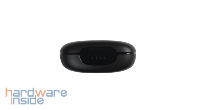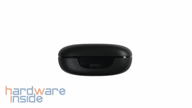 Das Ladeetui ist komplett in Schwarz gehüllt wobei der Deckel und die Unterseite eine raue und fingerabdruckabweisende Oberfläche besitzen. Die Ladeschale ist komplett aus Kunststoff gefertigt aber fühlt sich hochwertig an. Das Tribit Logo auf dem Deckel sowie die Seitenkanten weisen eine glänzende Oberfläche auf. An der vorderen Seite sind vier LEDs angebracht, die beim Öffnen des Cases und beim Laden auf verschiedene Arten leuchten. Auf der Rückseite kann das USB-C-Kabel für den Ladevorgang angeschlossen werden. Die Unterseite beherbergt einige Spezifikationen und Informationen zur Leistung.