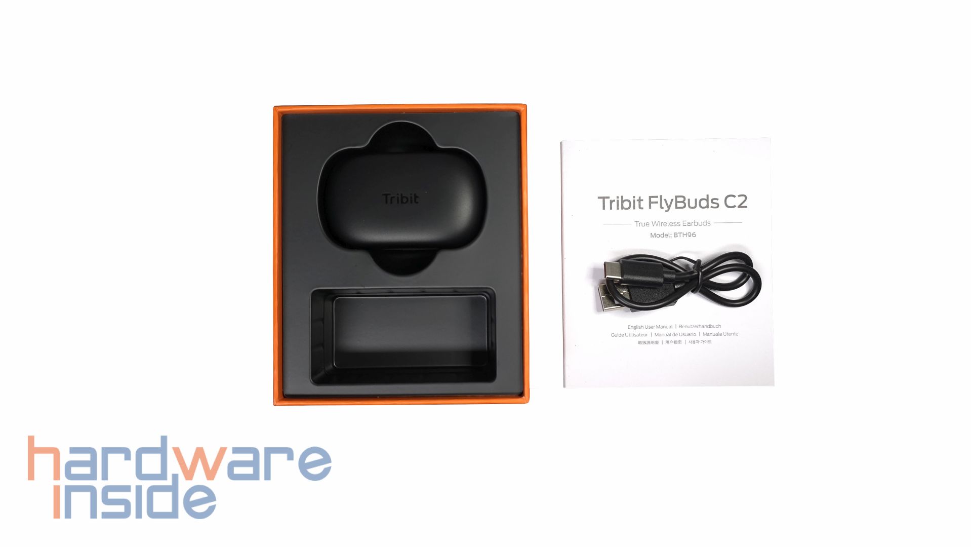 Der Inhalt ist übersichtlich, denn in der Verpackung ist eine Anleitung in verschiedenen Sprachen, ein 30 cm langes USB-A auf USB-C Kabel und das Ladecase mit den Tribit FlyBuds C2 enthalten.