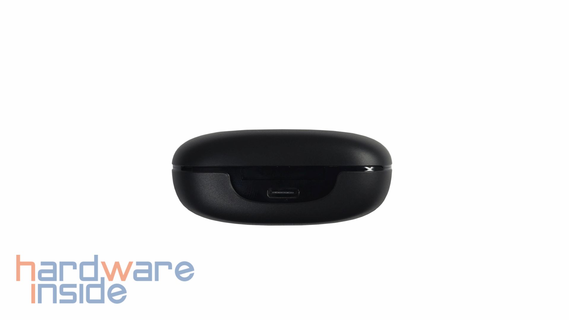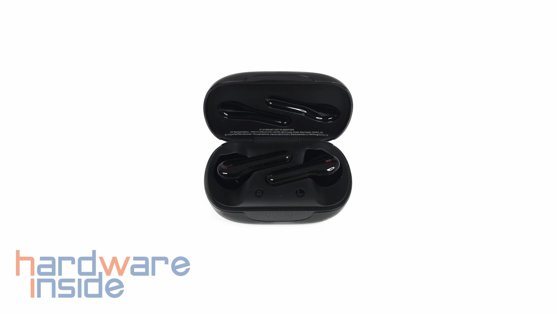 Der Deckel der Ladeschale wird magnetisch gehalten. Bei geöffnetem Etui kann durch leichte Bewegung der Deckel wieder zufallen. Innerhalb der Ladeschale sind die Aussparungen der Ohrhörer zu sehen. Die rechte Aussparung ist für den linken Ohrhörer und die linke Aussparung für den rechten Ohrhörer, wie an den markierten Stellen mir „R“ und „L“ zu sehen ist. In den Aussparungen sind jeweils zwei Ladekontakte platziert, die die Ohrstöpsel magnetisch fixieren.