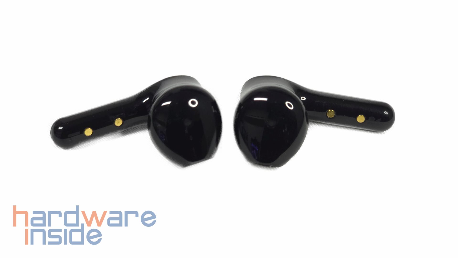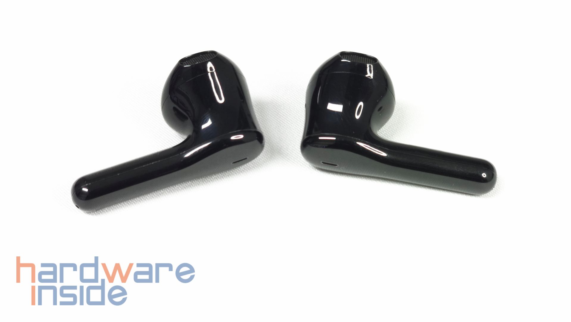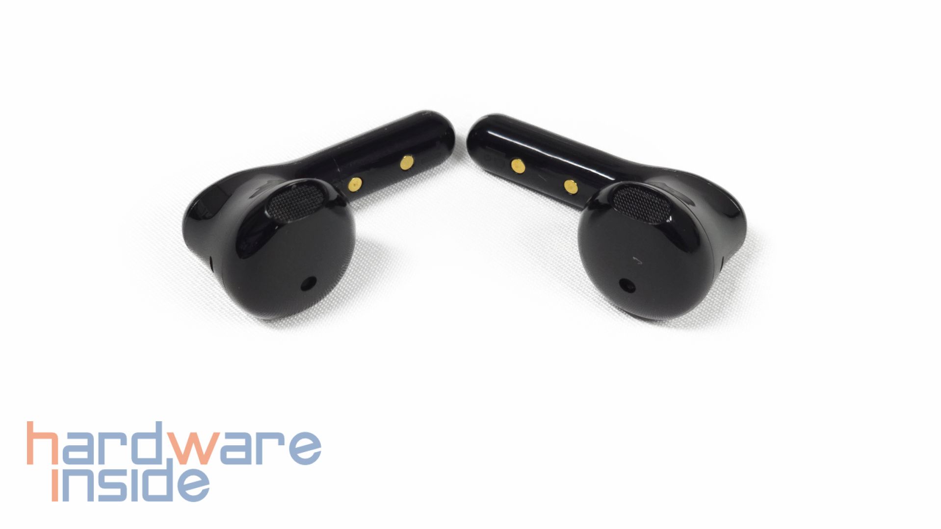 Im Gegensatz zum Ladecase haben die Tribit FlyBuds C2 Ohrstöpsel eine komplett glänzende Oberfläche. Das Semi-In-Ear-Design hat an den zwei Öffnungen ein schwarzes Netz zum Schutz vor Partikeleintritt. An der Innenseite der Ohrhörer sind zwei goldene Kontakte zum Aufladen. Weiter unten an der langen Seite ist ein Mikrofon platziert. Hier ist auch eine leichte „L“ respektive „R“ Markierung eingraviert. An der dickeren Seite ist eine Touch-Oberfläche zur Bedienung und ein weiteres Mikrofon platziert. Außerdem ist knapp unter dem oberen Mikrofon eine Anzeigeleuchte.