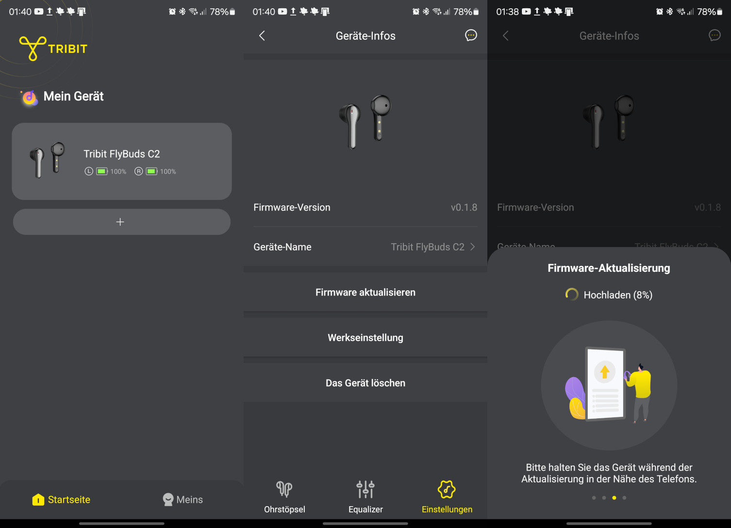 Die App von Tribit, die alle unterstützten Bluetooth-Geräte vereint, eröffnet noch zusätzliche Features. Das Login ist auch ohne Registrierung möglich und zeigt zuerst die verfügbaren und verbundenen Geräte und deren Ladestatus. Unter den Geräteinfos können die Firmware aktualisiert und die Werkseinstellung vorgenommen werden.