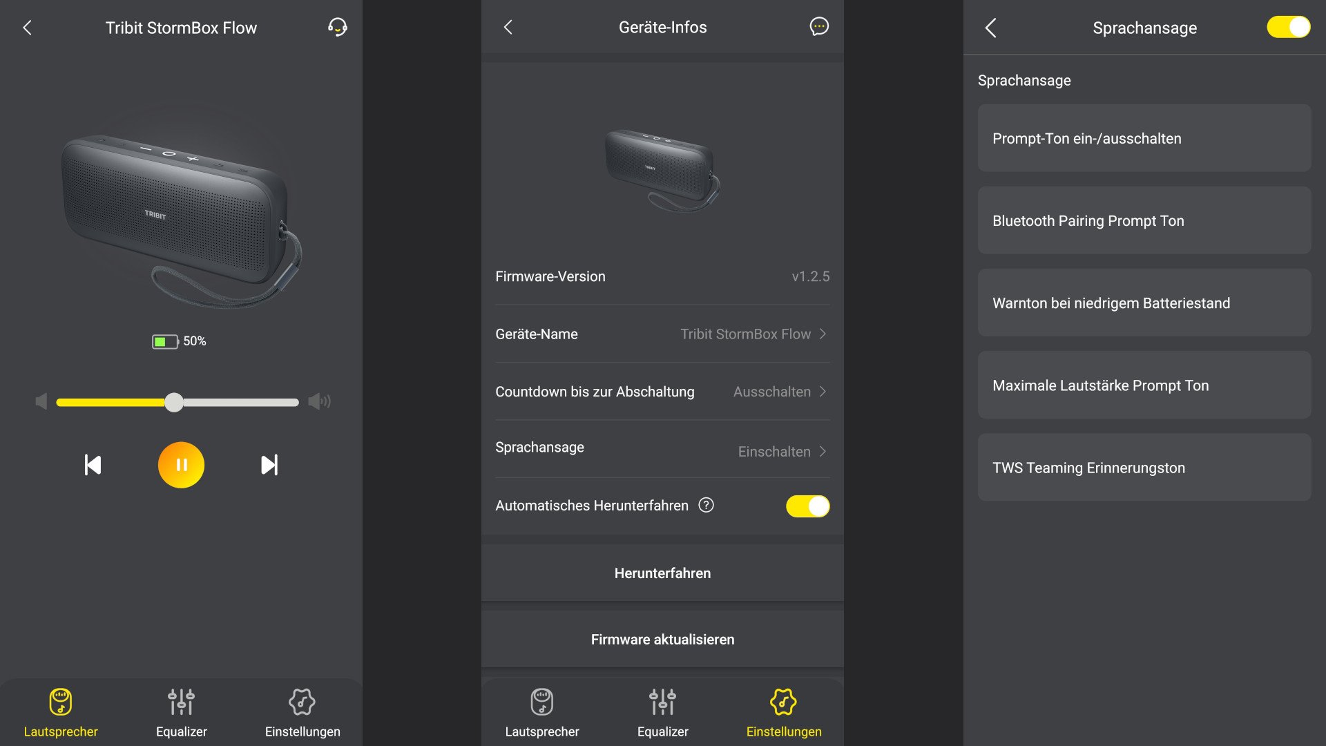 TRIBIT gestaltet seine Produkte so, dass keine App nötig ist, um sie zu nutzen. Trotzdem wollen wir noch gerne einige Einstellungen und Features mit der mobilen App aufzeigen. Die App zeigt die Tribit-Geräte an, die per Bluetooth verbunden wurden. Wir wählen unsere TRIBIT StormBox Flow und können direkt ein Firmware-Update durchführen. Im Hauptbildschirm können wir über den Touchscreen die Lautstärke einstellen und den Status des Akkus ablesen. Dabei sehen wir eine Abbildung unserer StormBox und darüber den Namen des verbundenen Gerätes, den wir auch selbst anpassen können.