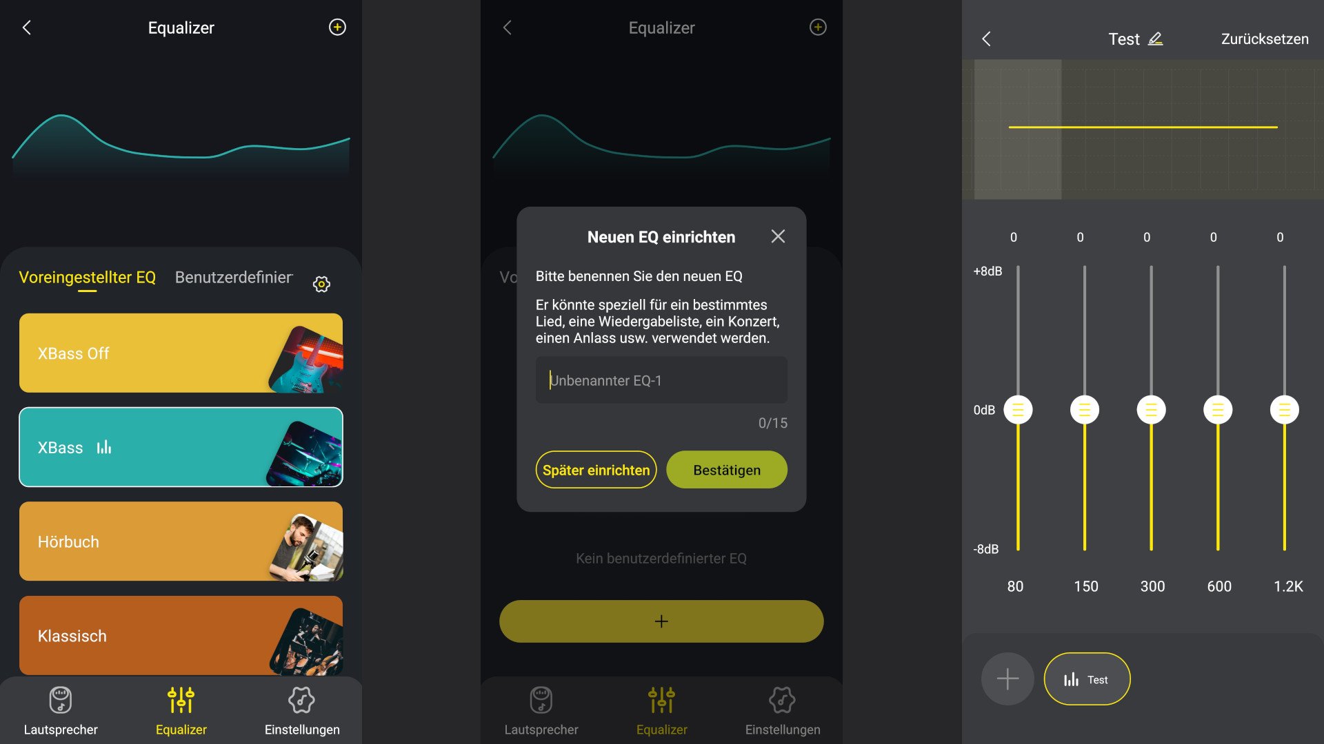 Weiter besitzt die App einen umfangreichen Equalizer, bei dem viele voreingestellte Soundprofile zur Auswahl stehen. Daneben können wir einen eigenen Equalizer anpassen, der über 10 Bänder an den eigenen Musikgeschmack angeglichen werden kann. Es ist ebenfalls möglich, diese eingestellten Equalizer mit einem Namen zu versehen und als Profil zu speichern. Die Einstellungen zum Produkt zeigen uns die aktuelle Version, erneut den Gerätenamen zum Anpassen, den einstellbaren Countdown zum Abschalten bei pausierter Wiedergabe, den Wiedergabeton bei verschiedenen Aktionen, wie das Erreichen der maximalen Lautstärke und der anpassbaren EQ-Taste am Korpus.