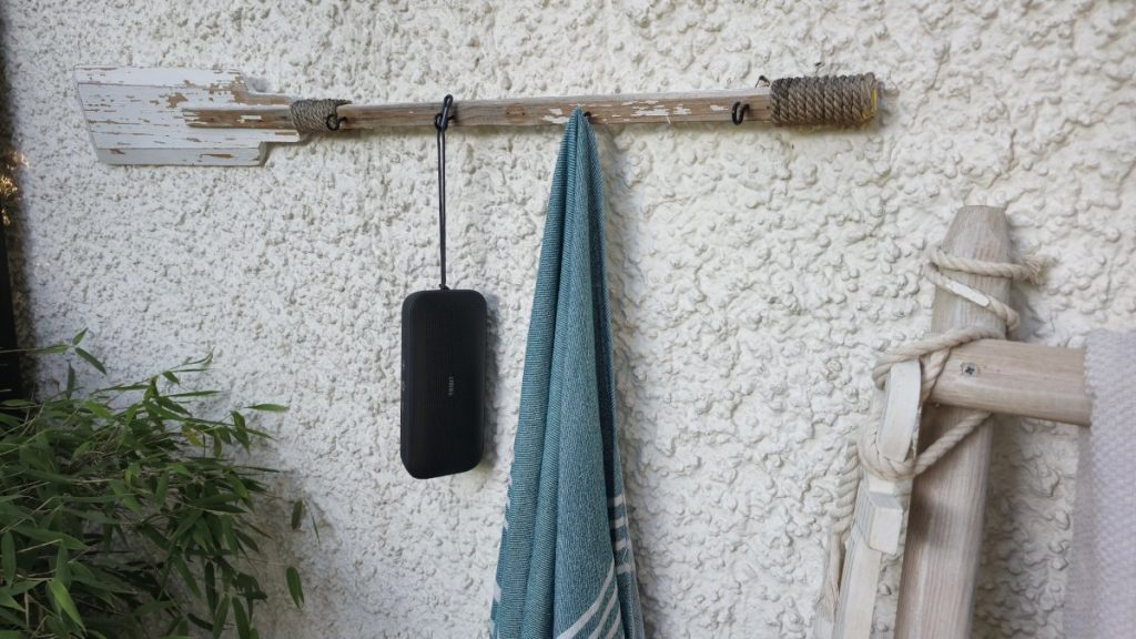 Auf der linken Seite befindet sich ein USB-C-Anschluss zum Laden der StormBox. Die rechte Seite besitzt eine Trageschlaufe aus Stoff in der gleichen Farbe wie die Flow selbst. Die Trageschlaufe passt auf eine Handgröße, die das Transportieren erleichtert. Die StormBox Flow kann auch an einen Karabiner oder andere Dinge angehängt werden. Das Endstück an der Schlaufe ist zum Einstellen der Größe der Schlaufe, die leicht auf und ab geschoben werden kann.