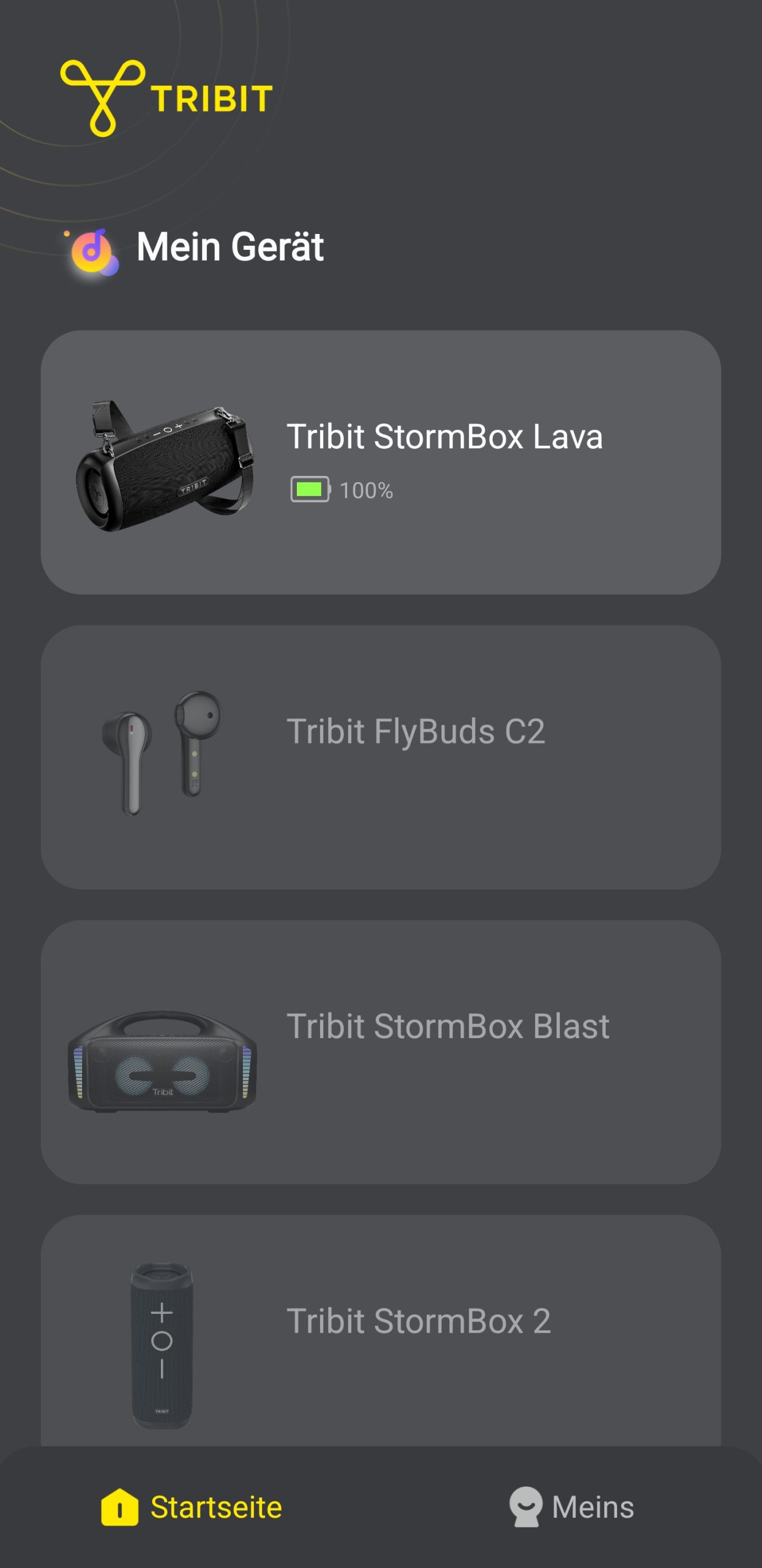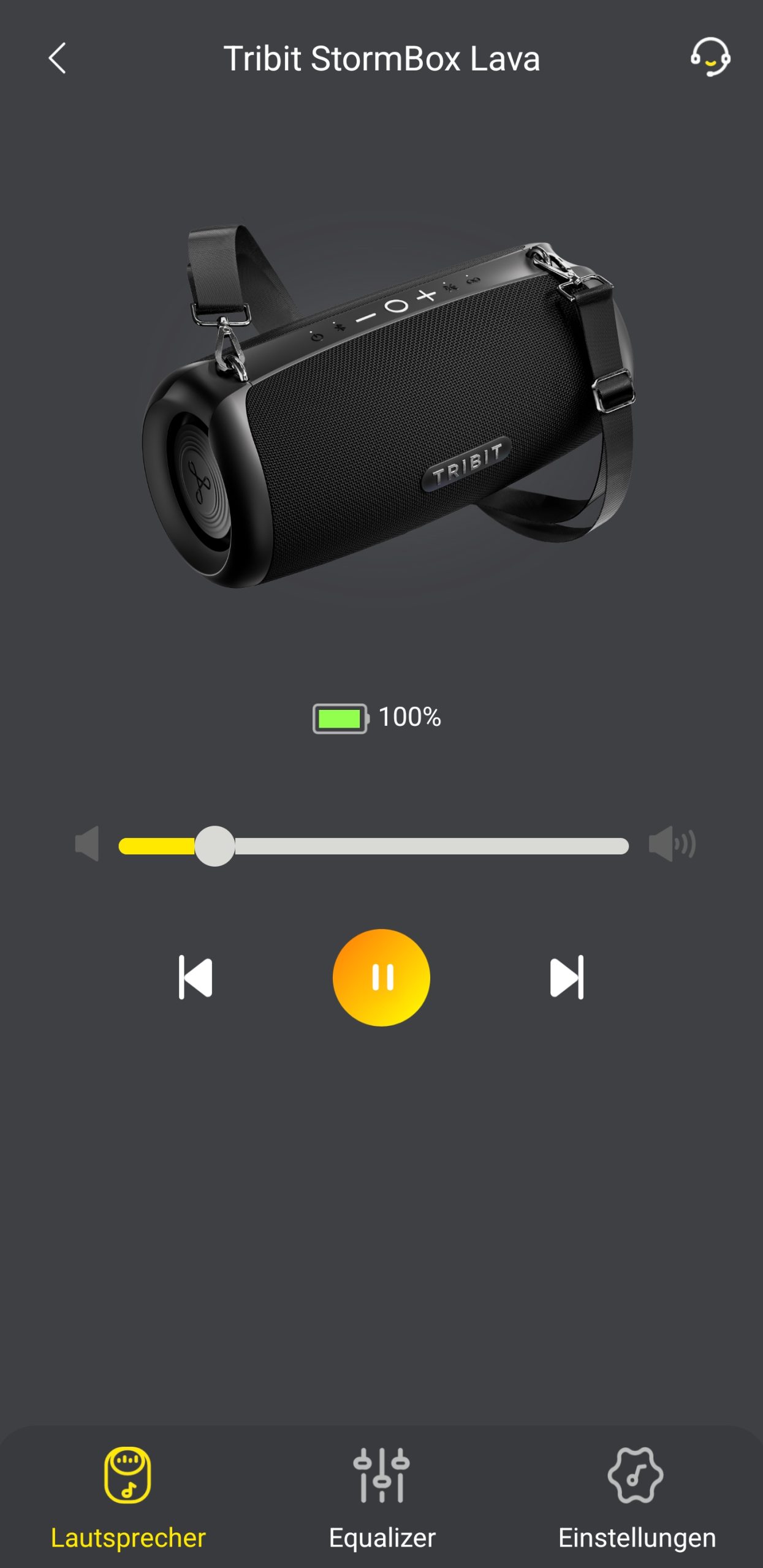 Der Startbildschirm der Tribit-App zeigt die gekoppelten Geräte und wir wählen die Tribit StormBox Lava, die bereits per Bluetooth verbunden ist und den Akkustand anzeigt. Das nächste Fenster zeigt die Lava in Schwarz, wieder den Akkustand, die Lautstärke, einen Pause-Button und die Wiedergabe vor und zurück. Die Equalizer-Rubrik bietet einige voreingestellte Szenen, wie Hörbuch, Musik, Rock, Party und weitere. Zusätzlich sind benutzerdefinierte Equalizer mit neun Frequenzbändern zum Einstellen von –6 dB bis +6 dB. Die Benutzerdefinierten können auch als Profile umbenannt und gespeichert werden. In den Einstellungen sehen wir die Firmware-Version, die wir aktualisieren können. Weiterhin können wir hier den Gerätenamen anpassen, den Countdown bis zur Abschaltung festlegen, die Sprachansage verfeinern, Werkseinstellungen triggern, das Gerät löschen oder es herunterfahren.