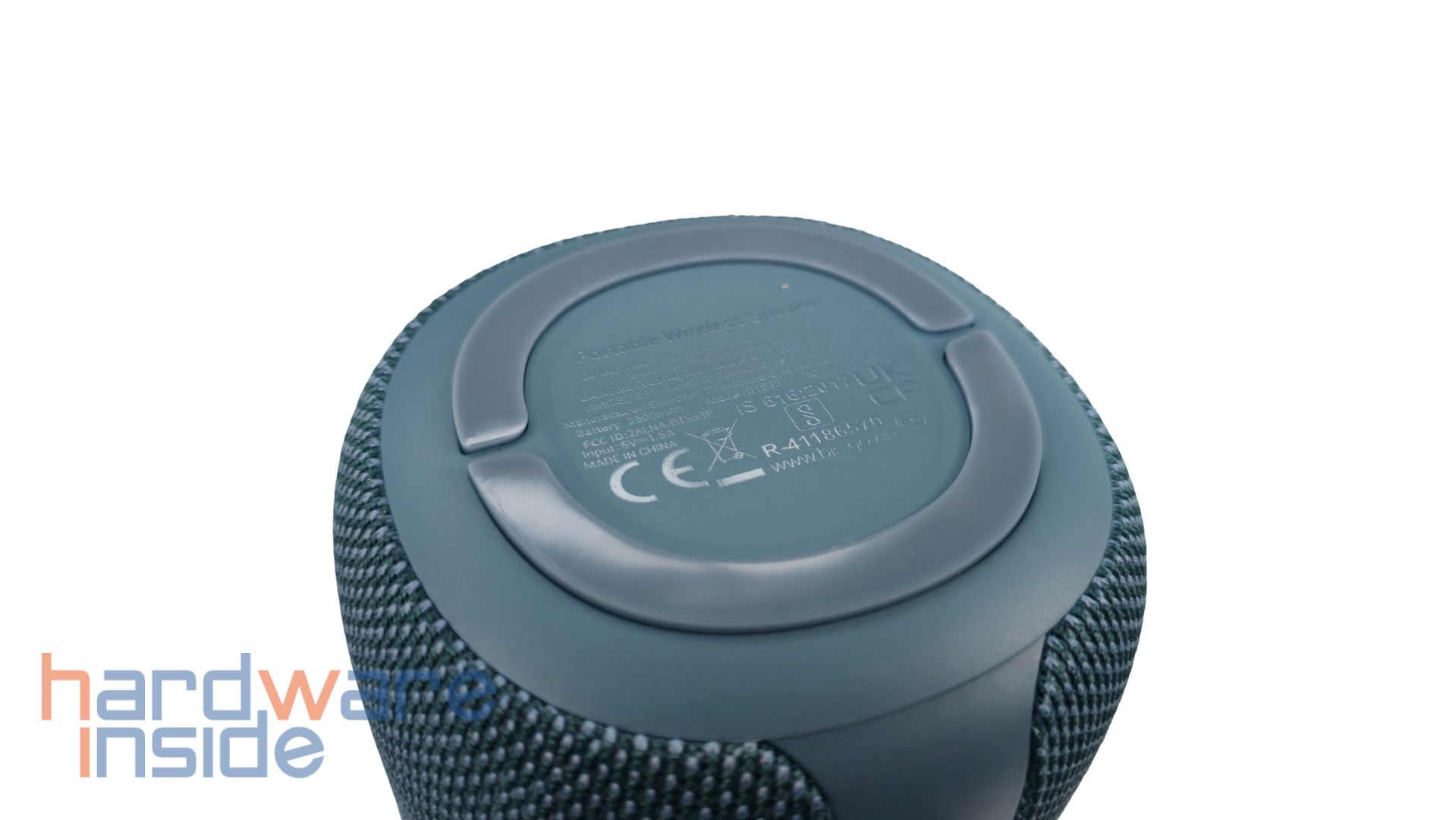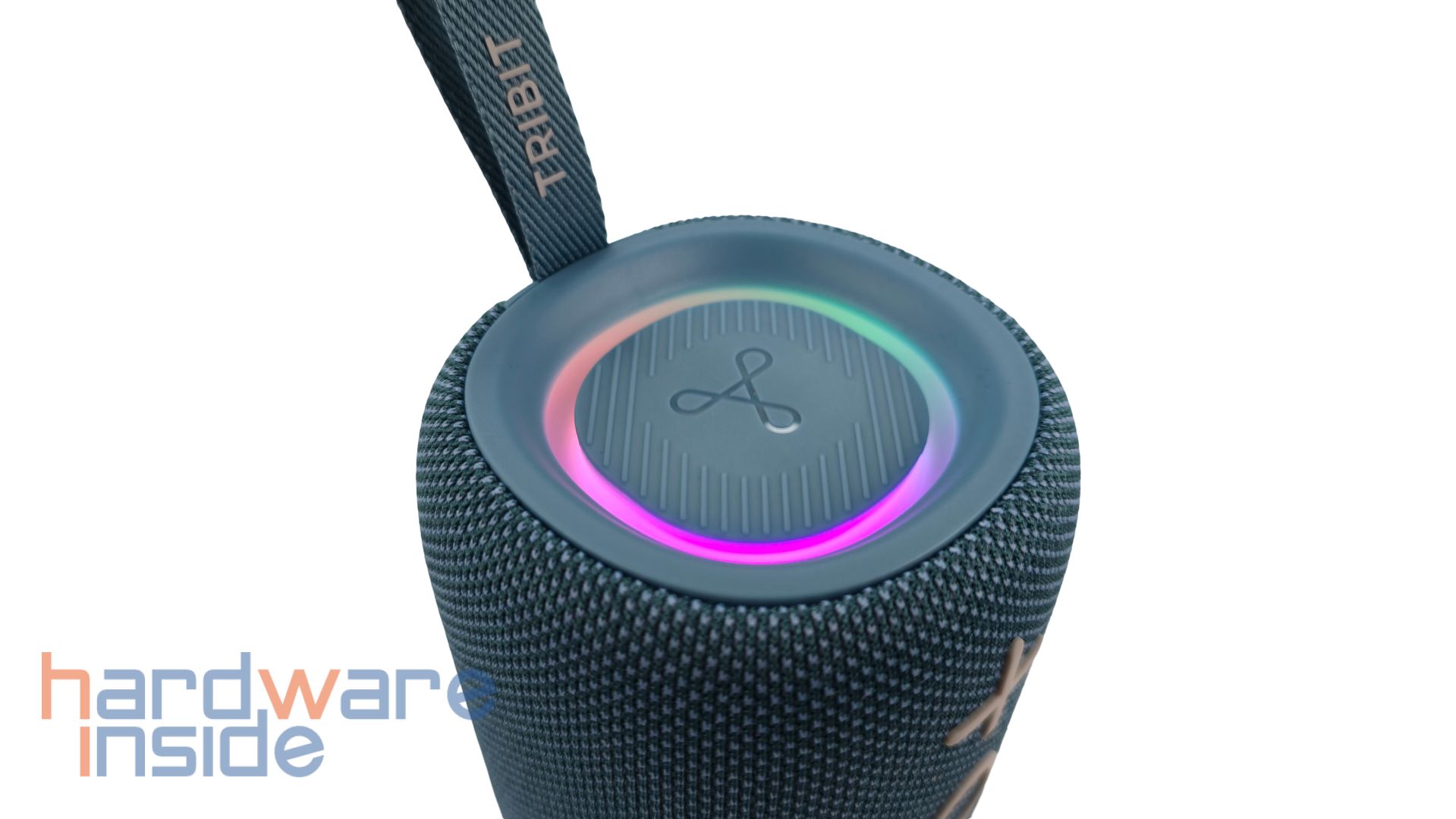 Die Oberseite trägt eine Trageschlaufe mit einem aufgeklebten TRIBIT-Schriftzug. Hier kann ein Karabiner platziert werden, wodurch der Lautsprecher an einem Rucksack, an der Jeans oder Ähnliches befestigt werden kann. In der Mitte der Oberseite sitzt eine Membran mit einem Herstellerlogo in der Mitte. Die Membran ist umgeben von weißem Material, das in Betrieb in RGB beleuchtet werden kann.