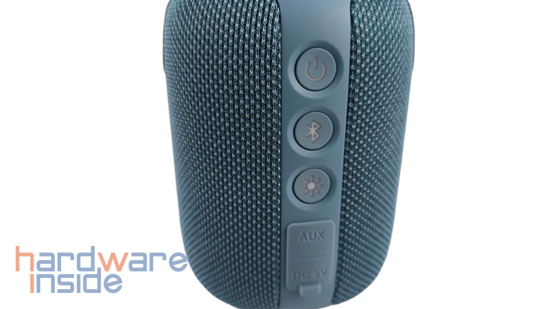 In der Rückseite der TRIBIT StormBox Mini+ sind die Bedienelemente eingearbeitet. Von oben nach unten finden wir hier den Einschalt-Knopf, einen Bluetooth-Button und die Steuerung zur RGB-Beleuchtung. Die Knöpfe eher weich und „clicky“ bei Bedienung. Unter den Knöpfen befindet sich eine gummierte Abdeckung mit der Aufschrift AUX und DC 5V. Darunter verbirgt sich eben ein Klinkenanschluss und eine USB-C-Buchse zum Aufladen des Bluetooth-Lautsprechers. Um die Schutzklasse von IPX7 zu gewährleisten, sollte diese silikonartige Abdeckung geschlossen gehalten werden.
