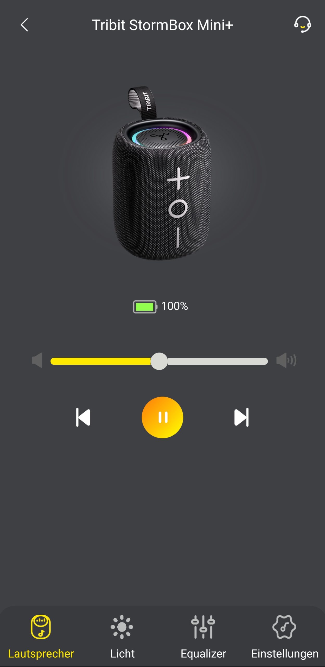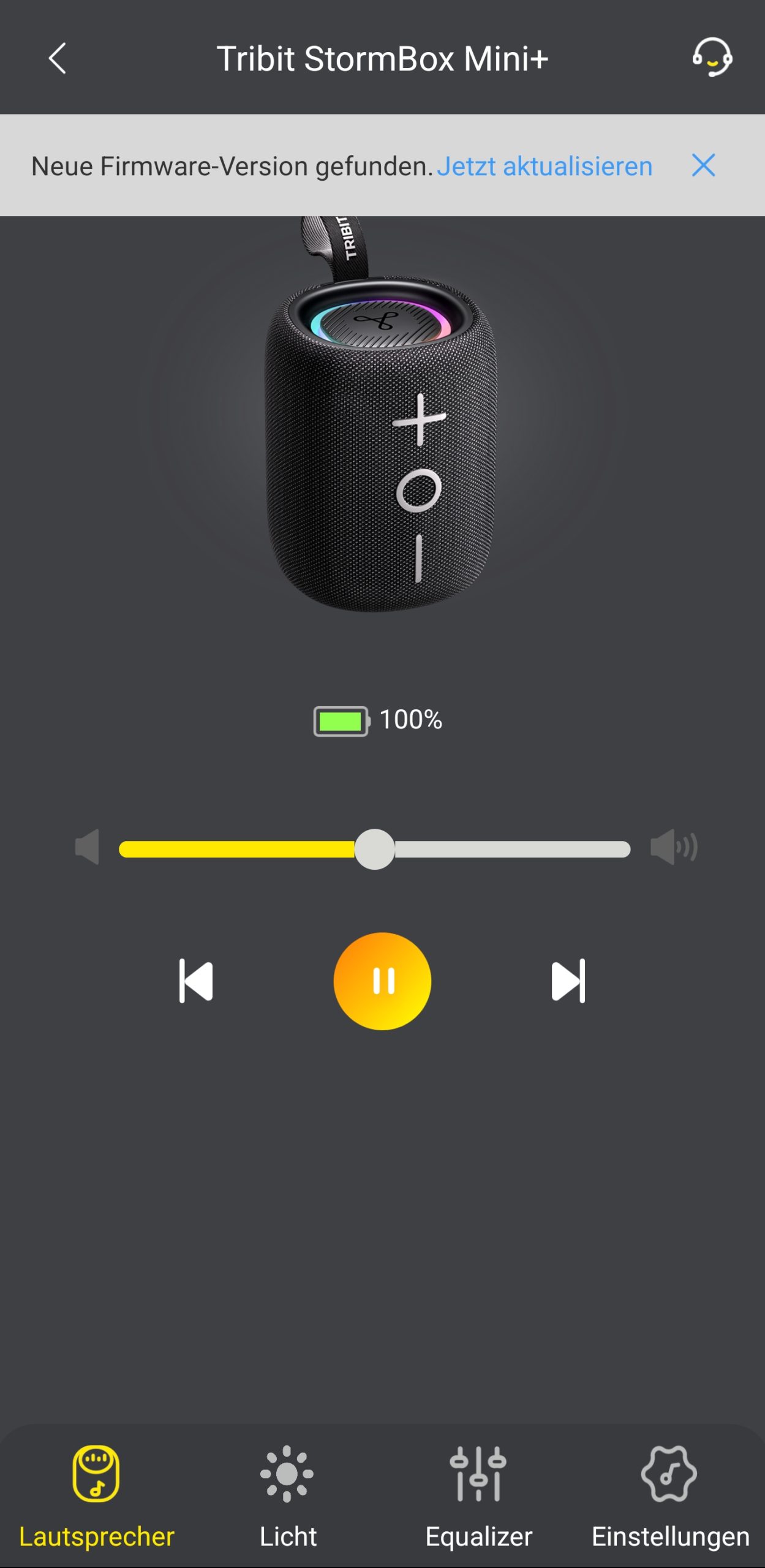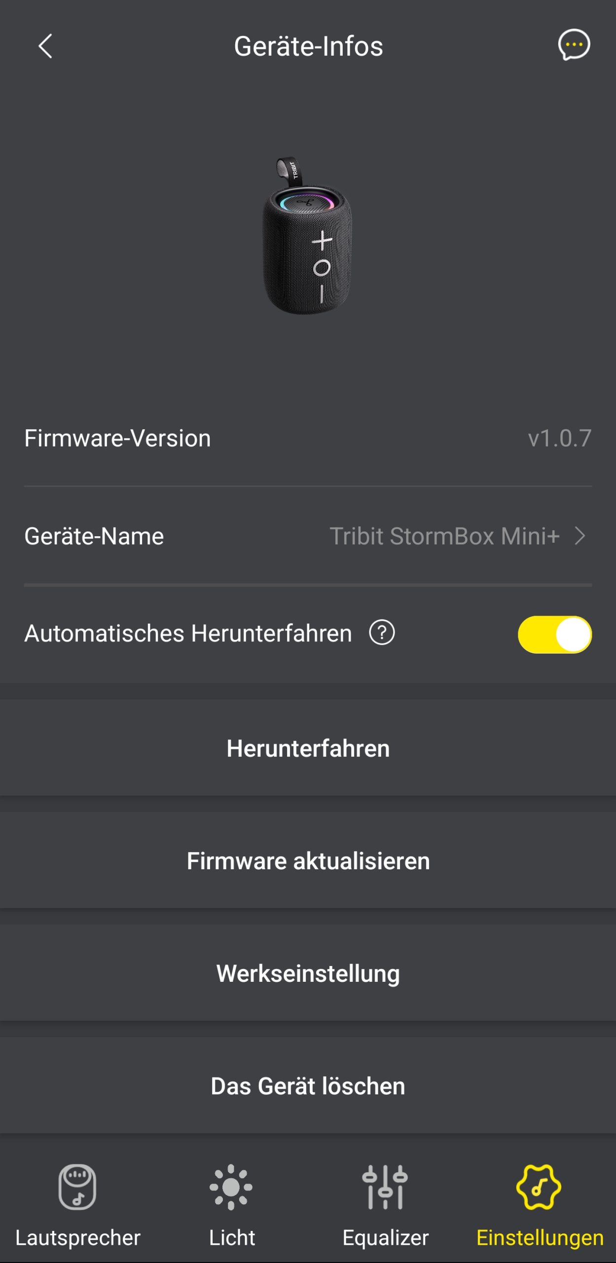 In der Tribit App wird gleich bei der Verbindung auf neue Firmware hingewiesen, die fast von selbst installiert wird, es wird nur eine Bestätigung verlangt. In der Geräteauswahl steht die Mini+ bereit. Nach der Auswahl sehen wir die Lautstärkensteuerung, Play und Pause, sowie Vor- und Zurückschalten der Titel. Weiterhin ein Bild des Produkts und den aktuellen Akkustand. An der Unterseite können vier Register gewählt werden. Bei dem Licht kann zwischen zwei Modi gewechselt werden, wobei der dies durch den Beleuchtungsknopf praktisch schneller geht und außerdem noch ausgeschaltet werden kann. Beim Equalizer sind viele Voreinstellungen vorhanden, wobei auch benutzerdefinierte Equalizer gespeichert werden können. In dem Register Einstellungen kann die Firmware-Version abgerufen, auf Werkseinstellungen zurückgesetzt, das Gerät gelöscht und die Firmware aktualisiert werden. Das Beste hierbei ist das Herunterfahren über Distanz.