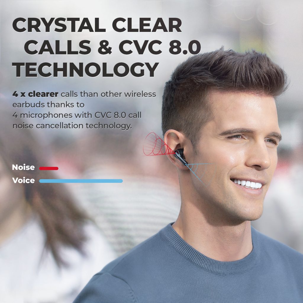 Dank der neuesten CVC-Technologie (Clear Voice Capture) von Qualcomm® sind Nutzer der FlyBuds C1 für ihre Gesprächspartner immer klar und rauschfrei zu verstehen – auch wenn sie sich in lauten Umgebungen befinden: Die vier in den FlyBuds verbauten Mikrofone filtern in Verbindung mit dem ENC-Feature (Environmental Noise Cancellation) bis zu 90 Prozent aller Hintergrundgeräusche effektiv heraus und lassen so nur die Stimme des Nutzers beim Gesprächspartner glasklar und verständlich ankommen.