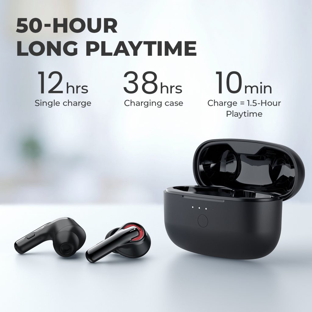 Der deutlich geringere Stromverbrauch des aktuellen Bluetooth-5.2-Standards hilft den FlyBuds C1 zusammen mit den beiden 60-mAh-Batterien in den Kopfhörern sowie dem 600-mAh-Akku im Transportbehälter extrem lange Laufzeiten zu realisieren: Nominell können die Kopfhörer bis zu 12 Stunden ohne Nachladen genutzt werden, während der Ladebehälter, in dem die Kopfhörer in nur anderthalb Stunden komplett aufgeladen werden können, noch einmal Energie für bis zu 50 Stunden Nutzung bereithält. Aber auch danach kann es fast unterbrechungsfrei weitergehen, da sich der Ladebehälter mit dem mitgelieferten USB-C-Kabel in nur zwei Stunden wieder auf volle Kapazität bringen lässt. Und in Notfällen, zum Beispiel bei kurzfristig angekündigten Calls, können die FlyBuds sogar in nur 10 Minuten für eine Laufzeit von ganzen anderthalb Stunden geladen werden.