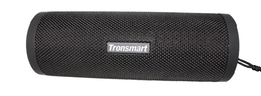 Hat man den Tronsmart Force ausgepackt, kann man feststellen, dass der Lautsprecher sehr hochwertig verarbeitet ist. Der kompakte Force 2 ist schwarz und hat ein wasserdichtes Gewebe als Gehäuse. An den Enden ist jeweils ein Bassradiator für tiefen Bass angebracht. Die Ränder sind aus Gummi gefertigt und bieten so auch rutschfesten Halt, wenn man den Lautsprecher hochkant stellen möchte. Das Logo ist auf beiden Bassradiatoren mittig angebracht. Eine Trageschlaufe ist bereits ab Werk angebracht, lässt sich aber auf Wunsch mühelos entfernen. Von der Seite betrachtet, erkennt man die untypische Form: ein runder Lautsprecher mit einer Erhebung nach Hinten heraus. Das ist besonders Vorteilhaft, denn so rollt der Bluetooth Lautsprecher nicht davon und zeigt immer mit der Klangrichtung zum Benutzer.