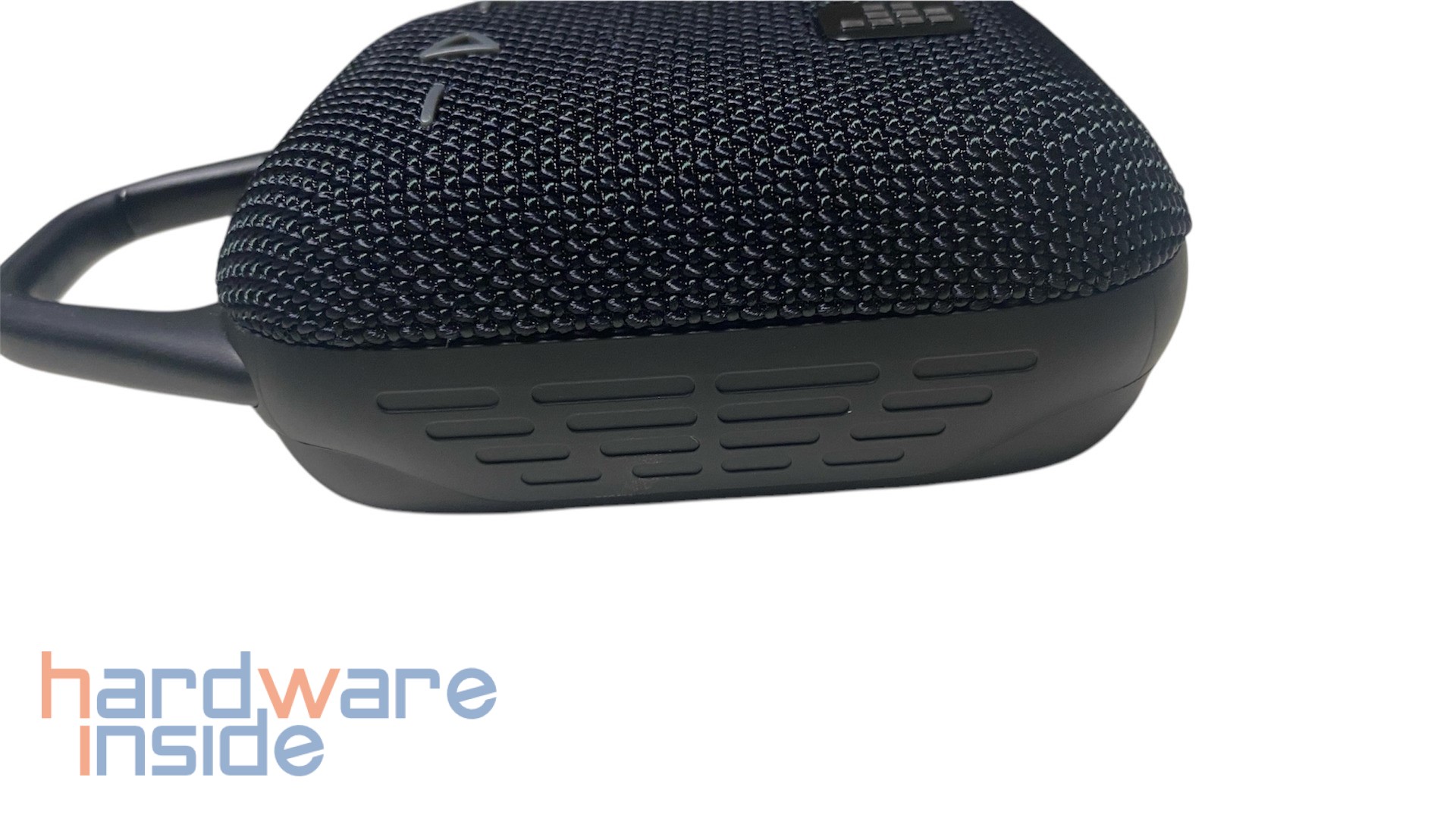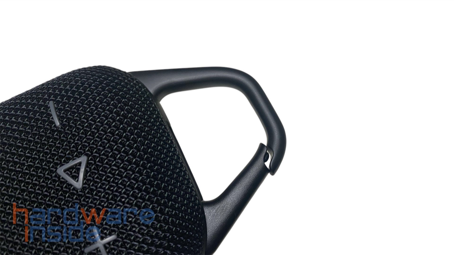 An der Oberseite des Gehäuses befindet sich ein Karabiner aus Metall, der sich nach innen öffnen lässt, um den kleinen Lautsprecher bequem befestigen zu können. So kann er praktisch überall hin mitgeführt werden.
