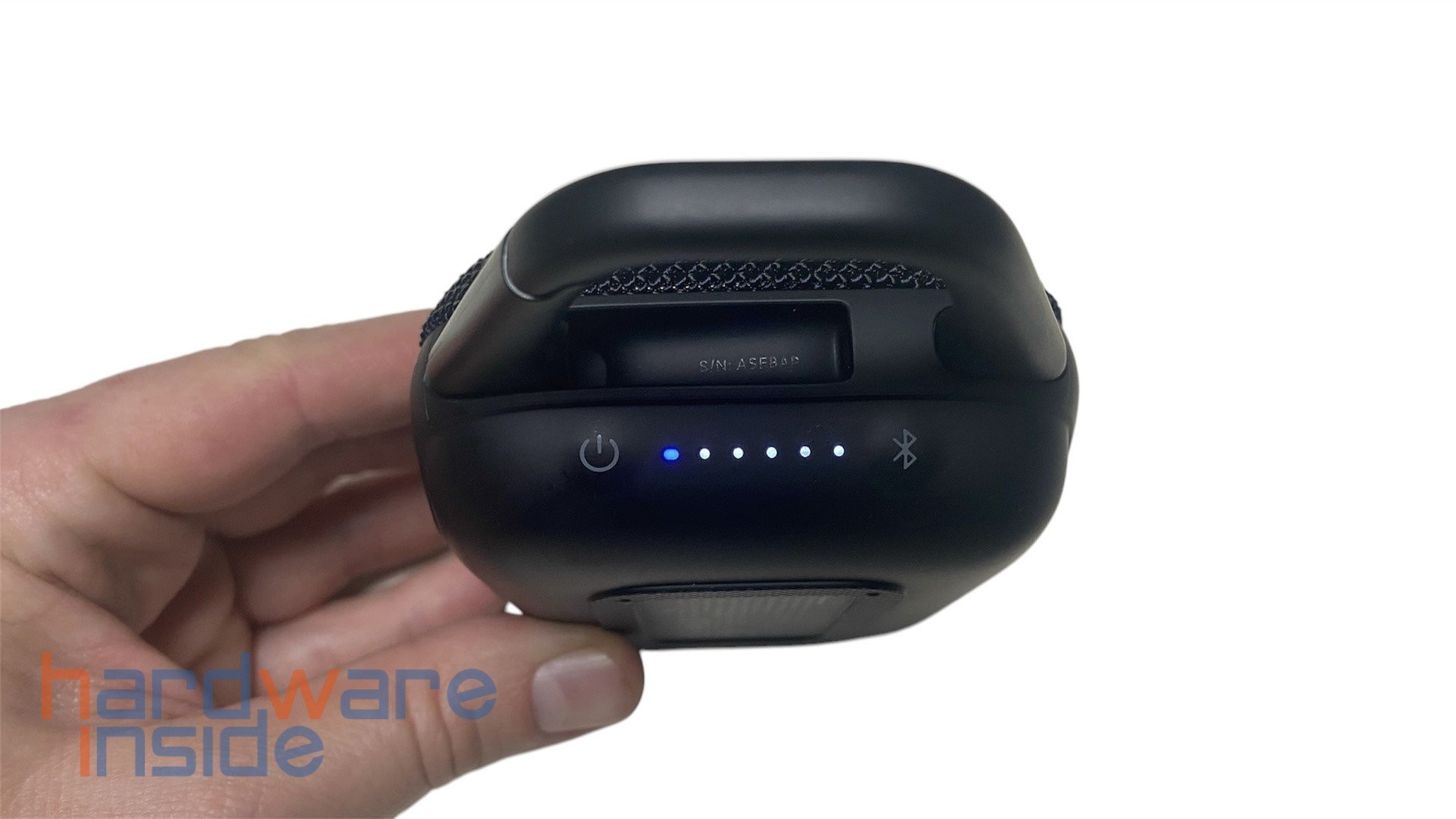 Auf der Oberseite des Gehäuses sind zwei Tasten untergebracht. Auf der linken Seite ist die Taste zum Ein- und Ausschalten und rechts daneben die Bluetooth-Taste, um den Mirtune H1 in den Pairing-Mode zu versetzen. Mit dem Feature TWS-Pairing kann sogar ein zweiter Mirtune H1 gekoppelt werden, um so noch einen größeren Bereich beschallen zu können. Zwischen den Knöpfen sind eine Reihe von LEDs in das Gehäuse eingearbeitet, die den Betrieb und auch gleichzeitig die Akkukapazität anzeigen. An der Unterseite ist die USB-C-Ladebuchse verbaut, um den kleinen Lautsprecher auch wieder aufladen zu können. Der integrierte Akku hat eine Kapazität von 2000 mAh.