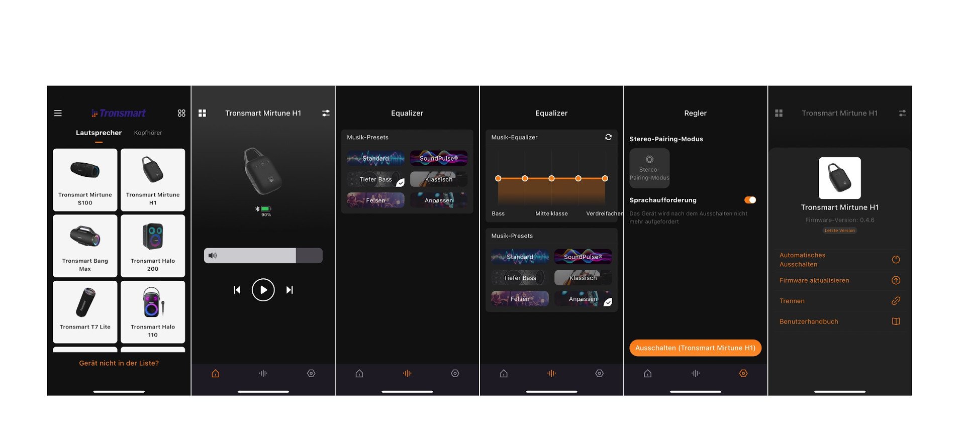 Um den Mirtune H1 nutzen zu können, ist eigentlich keine App notwendig, sie bietet aber die Möglichkeit weitere Einstellungen vorzunehmen. In der App lassen sich zum Beispiel die Firmware aktualisieren, das Handbuch anzeigen oder auch die Bedienungstöne anpassen. Ein automatisches Ausschalten lässt sich hier ebenfalls aktivieren, das auch funktioniert, wenn gerade Musik abgespielt wird. Über den integrierten Equalizer lassen sich fünf verschiedene Presets wählen oder eigene Einstellungen vornehmen. Auch die Kopplung eines zweiten Mirtune H1 kann hier vorgenommen werden. Die Bedienung funktioniert intuitiv, ohne dass Vorkenntnisse vorhanden sein müssen.