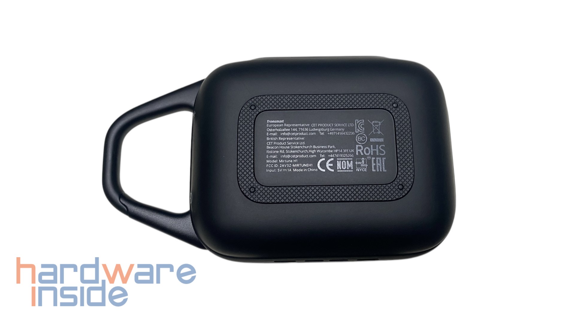 Nach dem Auspacken werfen wir einen ersten Blick auf den Mirtune H1, die Verarbeitung kann sich sehen lassen. Es gibt keine Nasen oder Kanten, alles wirkt sehr stabil und solide verarbeitet. Der Mirtune H1 sieht optisch wie ein Vorhängeschloss aus. Die Vorderseite ist mit einer Art schwarzem Meshgewebe bespannt. Auf dem Gewebe sind drei große silberne Tasten zur Steuerung implementiert. Auf der linken Seite ist die Minus-Taste zum Verringern der Lautstärke, in der Mitte die Play-/Stop-Taste und rechts daneben befindet sich die Plus-Taste zum Erhöhen der Lautstärke. Darunter sitzt eine Platte mit dem Tronsmart-Logo. Weitere Auffälligkeiten gibt es nicht.