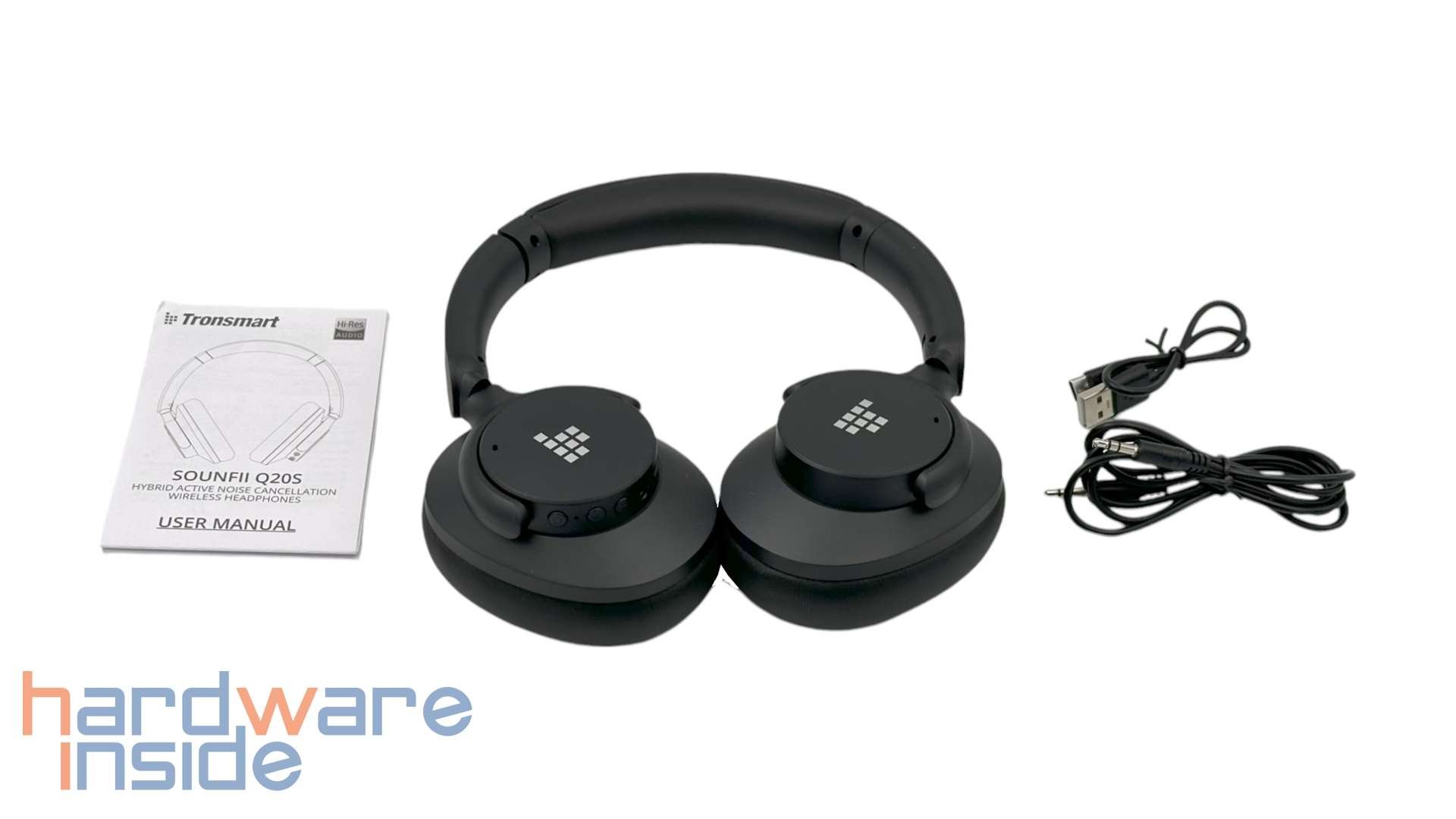 Der Lieferumfang ist übersichtlich, aber komplett. Neben dem Kopfhörer erhalten wir ein 20 cm kurzes USB-Kabel zum Aufladen (USB-A auf USB-C) und ein 100 cm langes Audiokabel (3,5 mm Audioklinke). Natürlich darf auch eine kurze Bedienungsanleitung und Hinweise auf die Garantie nicht fehlen.