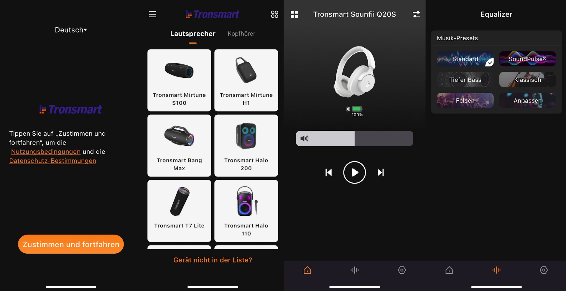 Die Inbetriebnahme gestaltet sich einfach, es muss nur die entsprechende Taste des Kopfhörers für drei Sekunden gedrückt werden. Anschließend finden wir den Kopfhörer in der Suche unsere Bluetooth-Menüs. Per se ist die Installation der Tronsmart App nicht zwingend erforderlich. Doch ermöglicht die App einige Einstellungen bequemer zu gestalteten. Die App ist für Android- und iOS-Geräte erhältlich. Nach der Installation werden wir aufgefordert, Nutzungsbedienungen und Datenschutz-Bestimmungen zu akzeptieren. Anschließend wählen wir aus einer Übersicht unseren Kopfhörer aus. In der Hauptansicht wird uns dieser angezeigt (allerdings nicht in der richtigen Farbe). Hier kann die Lautstärke eingestellt und Medien gesteuert werden. Im unteren Bereich finden wir zwei weitere Menüs vor. Im nächsten Menü gelangen wir zu den Equalizer Einstellungen.