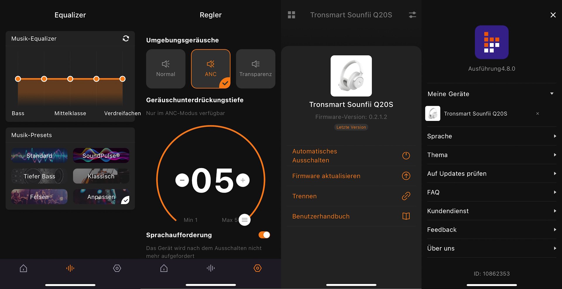 Hier können wir aus einem von fünf vorgefertigten Einstellungen wählen, oder im letzten Feld eigene Equalizer-Einstellungen vornehmen. Im letzten Menüpunkt können wir die aktive Geräuschunterdrückung und den Transparenzmodus einschalten und auch in fünf Stufen einstellen. Ein Druck auf das Symbol oben rechts führt zu einem weiteren Menü, wobei hier bei vor allem die Updatefunktion und das Benutzerhandbuch wichtig sind.