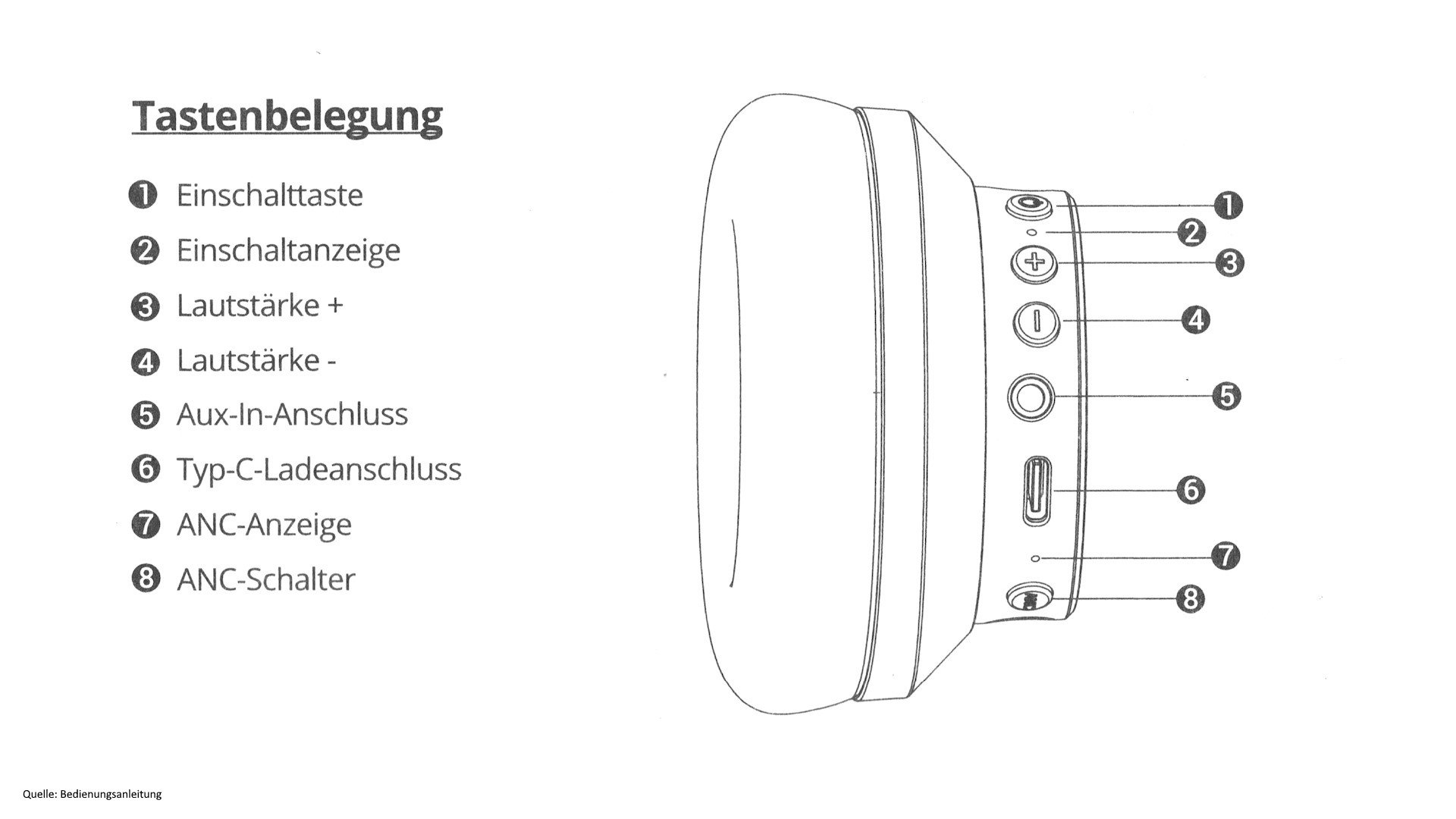 Die rechte Ohrmuschel verfügt über insgesamt über vier Tasten, einem 3,5 mm Audio-Anschluss und einem USB-Typ-C-Anschluss. Letzterer ist nur für das Laden des Akkus gedacht, das Headset lässt sich nicht über USB betreiben. Die Tasten sind mit Zeichen versehen, welche die jeweilige Funktion anzeigen. Einige Tasten sind allerdings mit mehreren Funktionen bedient – je nachdem wie oft oder wie lange die jeweilige Taste gedrückt wird, wird eine andere Funktion ausgeführt. Zwischen den Tasten befindet sich noch eine kleine LED, welche den Status des Kopfhörers und den Ladestatus anzeigt.