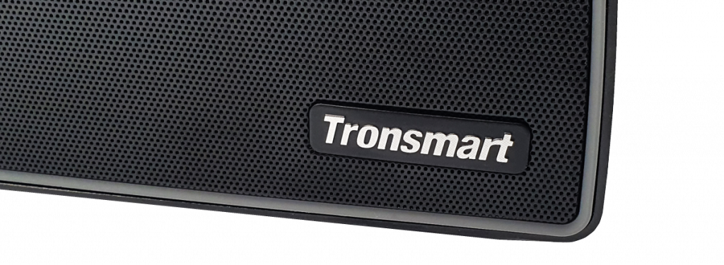 Der Tronsmart Studio Wireless Speaker wirkt mit seinem schwarz lackierten Aluminiumgehäuse sehr hochwertig. Die Front wird von einem schwarzen Gitter mit Herstellerlogo überspannt, hinter dem sich die Lautsprecher befinden. Insgesamt sind drei Lautsprecher verbaut, jeweils ein Hochtöner links und rechts. In der Mitte sitzt der Tieftöner. Auf der Oberseite finden wir die Bedienelemente.