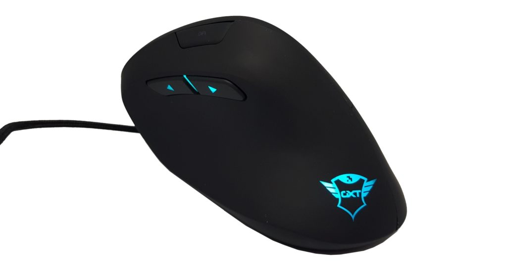 Die Trust GXT 144 Rexx ist von ihrer Größe her eine imposante Erscheinung. Das Gehäuse der Maus besteht aus schwarzem Kunststoff, der mit einer Softtouch-Oberfläche ausgestattet ist. Durch diese Oberfläche rutscht die Hand auch bei hitzigen Gaming Sessions nicht so leicht von der Maus herunter. Durch das ergonomische Design ist diese Maus ausschließlich für Rechtshänder geeignet. Dies ergonomische Form sorgt beim Nutzer dafür, dass die Hand nicht mehr einfach auf der Maus ruht, sondern das die Hand nach rechts abgekippt werden muss. Dadurch wird besonders das Handgelenk geschont. Von der GXT 144 Rexx geht ein 180 cm langes und mit Gewebe ummanteltes Kabel ab, welches in einem USB Anschluss endet.